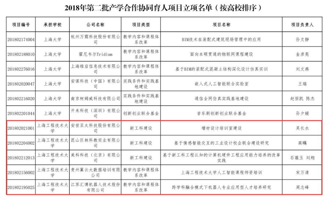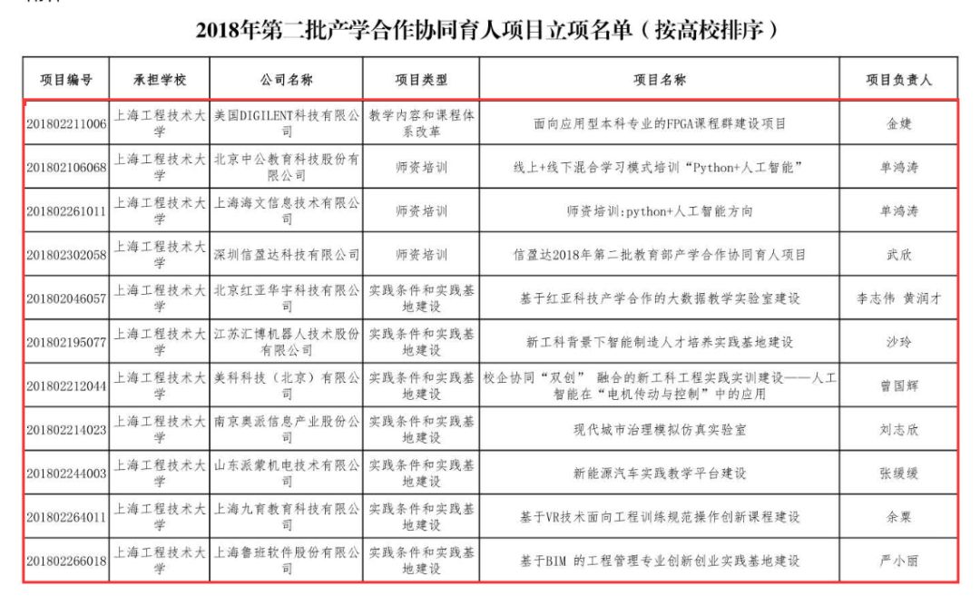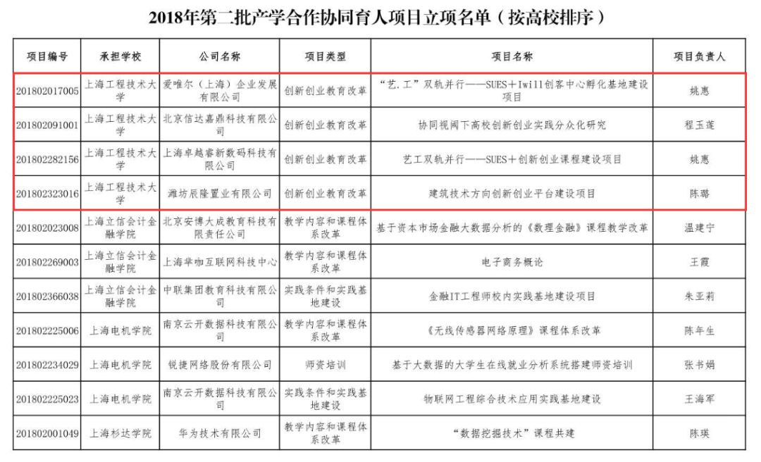 日前,教育部高教司发布《教育部高等教育司关于公布有关企业支持的2018年第二批产学合作协同育人项目立项名单的函》(教高司函〔2019〕12号),我校共有20个项目获批立项,立项总数位列上海高校第三。