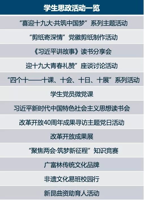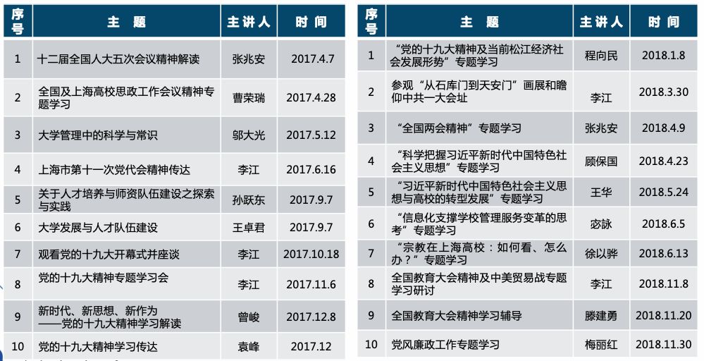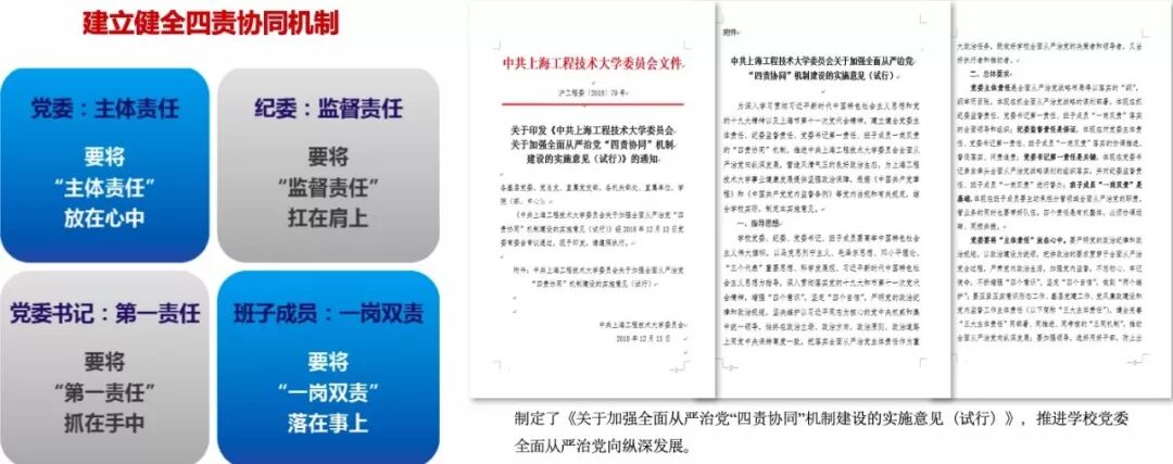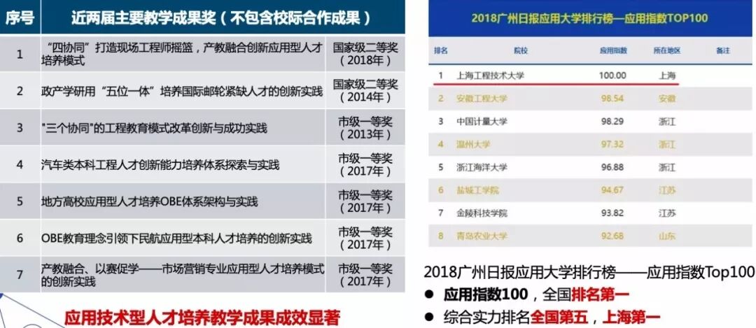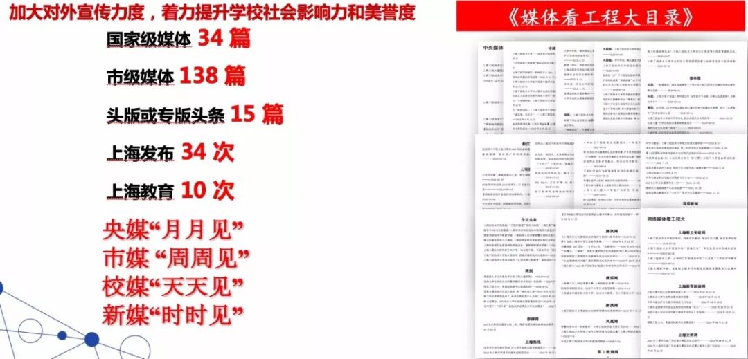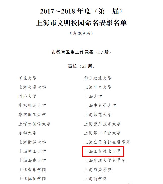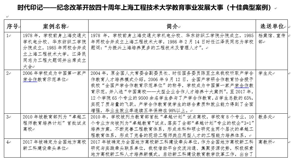 学校将校庆40周年工作与宣传改革开放成果相结合。通过举行“时代印记一一纪念改革开放四十周年上海工程技术大学教育事业发展大事典型案例” 颁奖仪式、“沐改革开放晨曦,创产教融合特色”学校四十年办学成果回顾、“四十人话四十年”线索全校征集、教师创新发展论坛等,以见证者讲述改革开放的变化。 文化共融,讴歌改革开放成果。校庆期间,全国121所高校@四十程园,和你一起,建设更好的大学! 工程大40周年校庆官方微博公众号发文阅读量共计50余万,40周年校庆微信公众号发文情况:阅读量共计23万,学校公众号关注人数增加10000人。 学校两年来共开展20次党委中心组集体学习活动,先后开展了“全国及上海高校思想政治工作会议精神”和“党的十九大精神与习近平新时代中国特色社会主义思想”校内宣讲活动,各二级党委(党总支)以二级中心组和教职工政治理论学习为抓手,不断提升理论素养,提高站位,不断深化理论学习成果。 校党委加强顶层设计,成立教师工作委员会。数年来党委教师工作部致力于深化师德教育效果,依托教学团队,推行教学改革,以“课程思政”建设为契机提升教师师德素养等。 学校举办“课程思政”教学改革论坛,贯彻全国教育大会精神,在全校设立了33个“课程思政”专项建设项目,投入资金44万。成立校党委讲师团,集体备课、无偿授课。 书记、校长新教师职业生涯第一课:师德师风建设从入职抓起。 成立由校党委书记和校长共同担任组长的学校课程思政教学改革领导小组和课程思政教学改革办公室,打造“交通中国”系列特色课程,将思想政治教育拓展到全校素质教育课程;加大经费投入,党委书记授课“学习新思想千万师生同上一堂课”。 我校与复旦大学等单位联合完成的教学成果《入耳入脑入心同向同行同频:以思政课为核心的课程思政教育教学改革与创新》被评为2018年高等教育国家级教学成果奖一等奖。 学校高度重视艺术教育工作,大力营造艺术教育大推动、大发展、大提升的浓厚氛围。学校舞蹈团入选全国大学生艺术展,荣获全国一等奖。 学校坚持健康第一的教育理念,重视高水平运动队的建设,在中国普通高校体育竞赛榜中排名第36位。继荣获泛波罗的海世界大学生运动会五人制足球亚军后,我校足球队又获得2018中国大学生五人制足球联赛亚军。 精心编制《大学精神与大学文化建设“十三五”规划》,植根中华优秀传统文化,构建传承与创新文化育人平台;积极举办“高雅艺术进校园”活动,开展秦腔、顾绣、芭蕾舞等高雅艺术进校园,邀请著名舞蹈家黄豆豆、中国工程院院士侯保荣、上海市政协常委曹珍富等来校主讲博学论坛和博雅讲堂,着力推动中华优秀传统文化创新发展。 去年学校召开第三次党代会,大力实施“人才强校、特色发展、国际化发展”三大战略,在实现内涵式发展、建设国内一流的高水平现代化工程应用型特色大学征程上,迈出更加坚实的步伐。 学校落实全面从严治党“三大主体责任”,制定了《关于加强全面从严治党“四责协同”机制建设的实施意见(试行)》,推进学校党委全面从严治党向纵深发展。 校党委认真落实全面从严治党向基层延伸的要求,积极探索组织员队伍建设的有效途径,在本市同类高校中率先设立专职组织员队伍,中组部于2017年10月到我校调研组织员工作。我校党建特色项目和组织生活案例荣获市教卫系统十佳项目和案例。 日常党建工作中,学校开展党员导师沙龙、党支部书记轮值会议等有效推进工作落实到位。 2017年,全国“新工科研究和实践”地方高校组牵头高校,2018年《广州日报》应用大学排行榜 —— 应用指数TOP100,全国排名第一。综合实力排名全国第五,上海第一。 去年5月学校第三次党代会提出“新三步走”战略,确立了学校中长期发展的总目标:5年后初步建成国内一流的高水平现代化工程应用型特色大学,10年后建成国内一流的高水平现代化工程应用型特色大学,15年后全面建成国内一流的高水平现代化工程应用型特色大学,在国际同类高校中进入第一阵营。 办学模式和人才培养模式显应用型特色,应用技术型人才培养教学成果成效显著。学校确立了高水平应用技术型高校五大建设任务:高水平应用型学科专业群建设、人才培养体系建设、创新平台建设、师资队伍建设、内部治理体系建设。其中,高水平应用技术型学科专业群建设目标为:传承学校“一体两翼”学科布局,重点建设“先进制造”“交通运输”“创意设计”三大学科专业群,使之成为国内一流的应用技术型学科专业群,打造2~3个有行业示范引领作用的一流应用技术型本科专业群,建设3~5个新工科应用技术型本科专业,8~9个工科专业通过中国工程教育认证,2~3个专业通过国际认证。 通过实施“走出校园促发展”,深度融入长三角一体化发展规划,秉承“创新、协调、绿色、开放、共享”的理念,构建“三层次、四落地”驱动体系,完善“政产学研用”合作机制,联组大团队、构建大平台、开发大课题、承接大项目、争取大经费、申报大奖项。近两年,学校签约国家战略4项、地区政府18家、企业集团20家、特色企业12家。 推进学校外延式发展,拓宽办学空间,助推学校内涵式发展。学校全面推进“松江校区二期”10.5万平方米现代交通中心工程等项目施工,累计完成投资2亿元; 实现