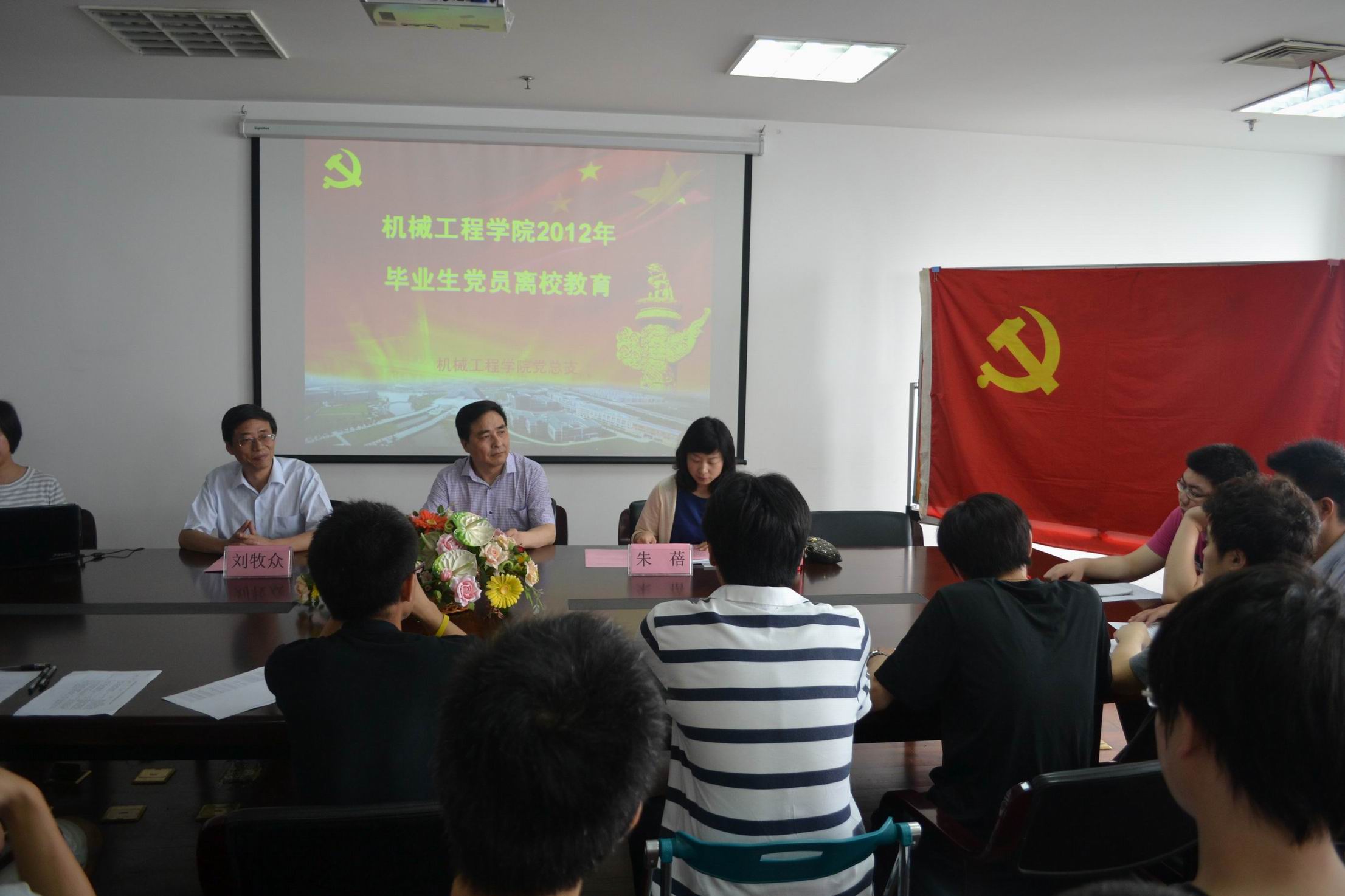 为了响应市教委党委组织干部处《关于做好2012年高校毕业生党员离校教育管理工作的通知》的精神, 6月8日上午10:00,机械工程学院在学院会议室1208开展2012届毕业生党员党性教育活动,机械工程学院院长程武山、党总支书记刘牧众、毕业班辅导员赵晔��、组织员曹雅致以及全体毕业生党员参加了活动,活动由学院党总支副书记朱蓓老师主持。本次活动主题围绕着“永葆共产党员先进性”展开。