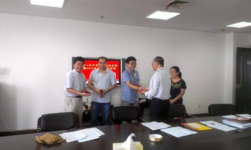 党总支副书记段海霞首先对2011年学院产学合作工作进行了总结,从加强质量控制、大学生科研训练计划、合作教育基地的拓展等方面进行了汇报,并宣布了2011年学院产学合作先进工作者和优秀协调员获奖名单。随后王岩松老师、吴训成老师分别为获奖老师颁发了证书,并合影留念。