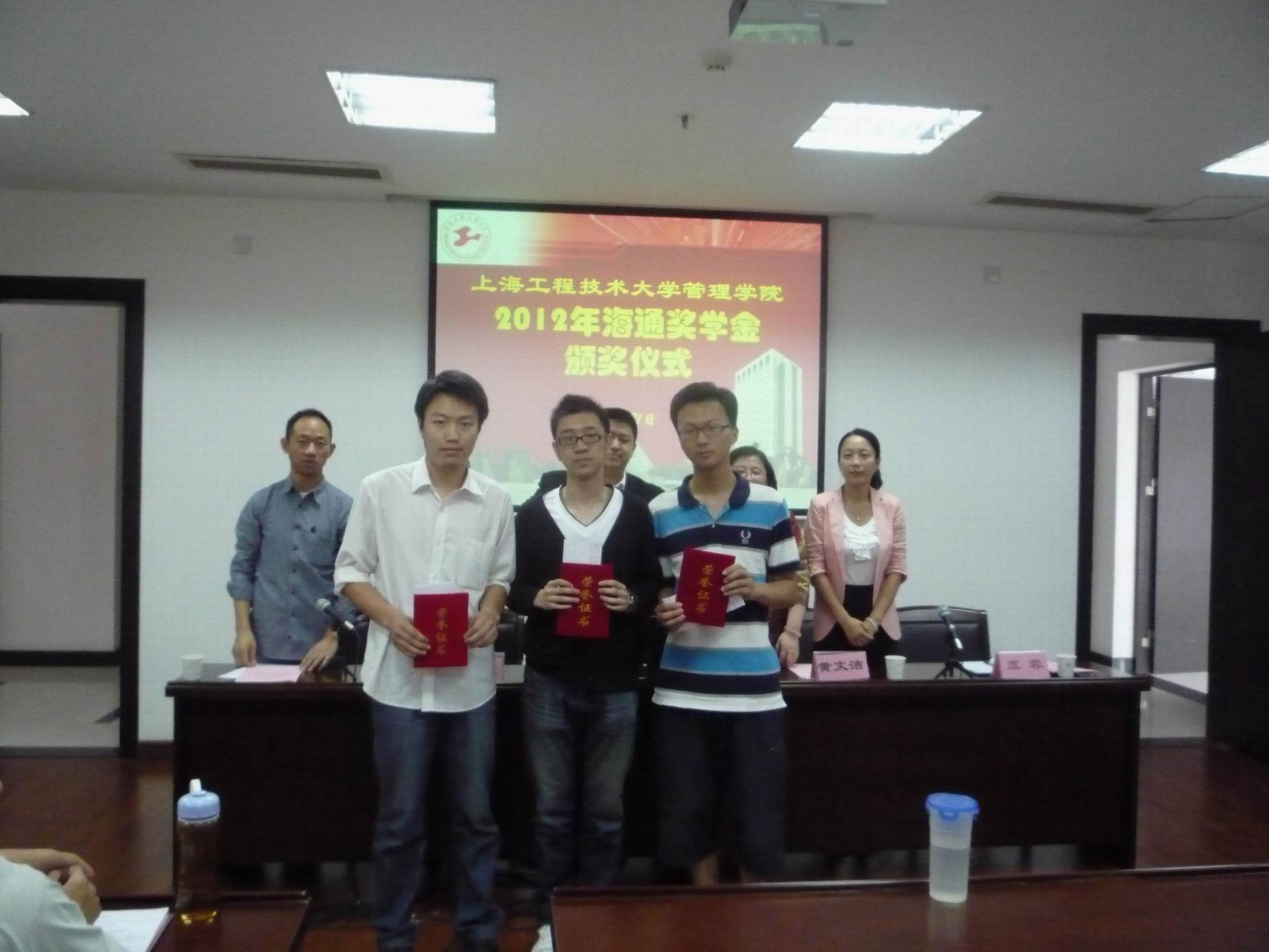 会议首先由海通证券项目经理彭微老师介绍了2012年“海通奖学金”的评审条件及评审情况,对同学们积极参与奖学金的热情表示了肯定和赞扬。随后学生处副处长黄文洁老师宣布了获奖学生名单,本次奖学金由王佳、张辉、李志东同学获得,在场领导共同颁发了奖状。