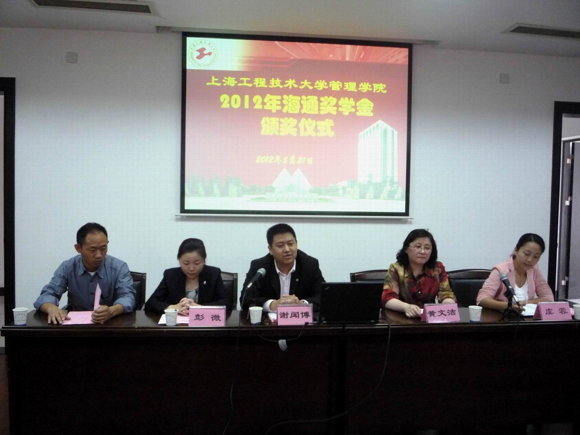 5月31日,管理学院与海通证券有限公司在行政楼205共同举办了2012年海通奖学金颁奖仪式,海通证券有限公司建国西路营业部营销总监谢闻博、海通证券项目经理彭微、学生处副处长黄文洁老师、管理学院党委副书记虞蓉老师出席了会议,会议由孟飞老师主持。