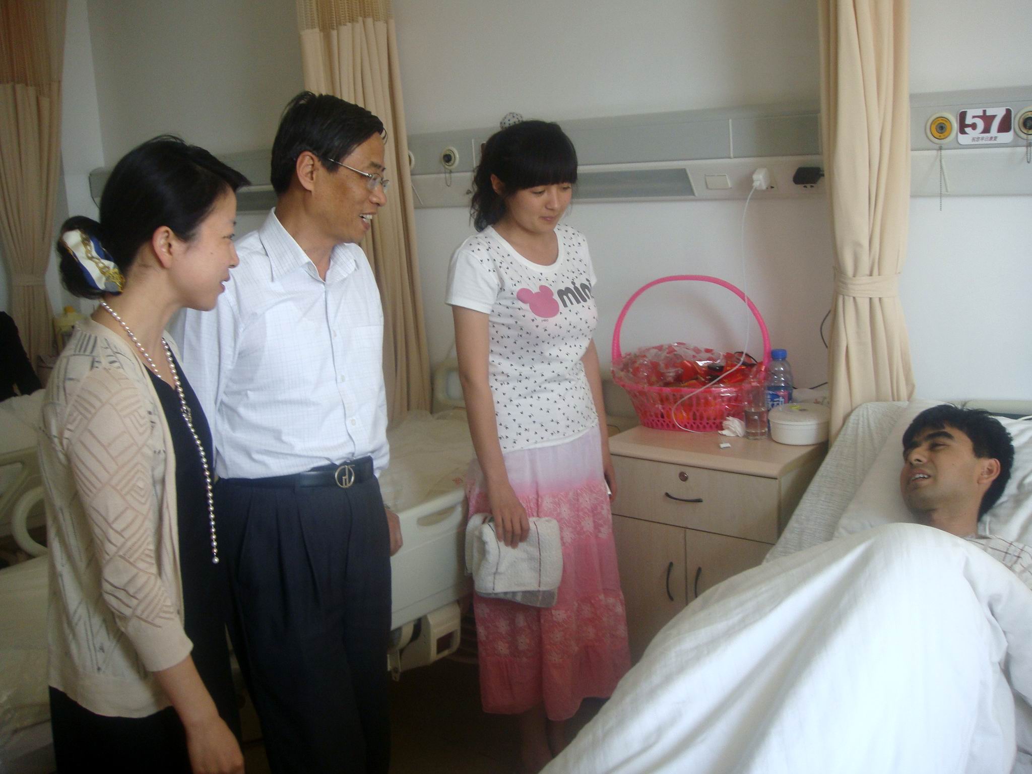 5月18日下午,机械工程学院党总支书记刘牧众、党总支副书记朱蓓、辅导员老师代表前往上海市第一人民医院,看望并慰问了阑尾炎手术开刀住院的机械工程学院09级少数民族同学木塔力甫·吐尔洪。