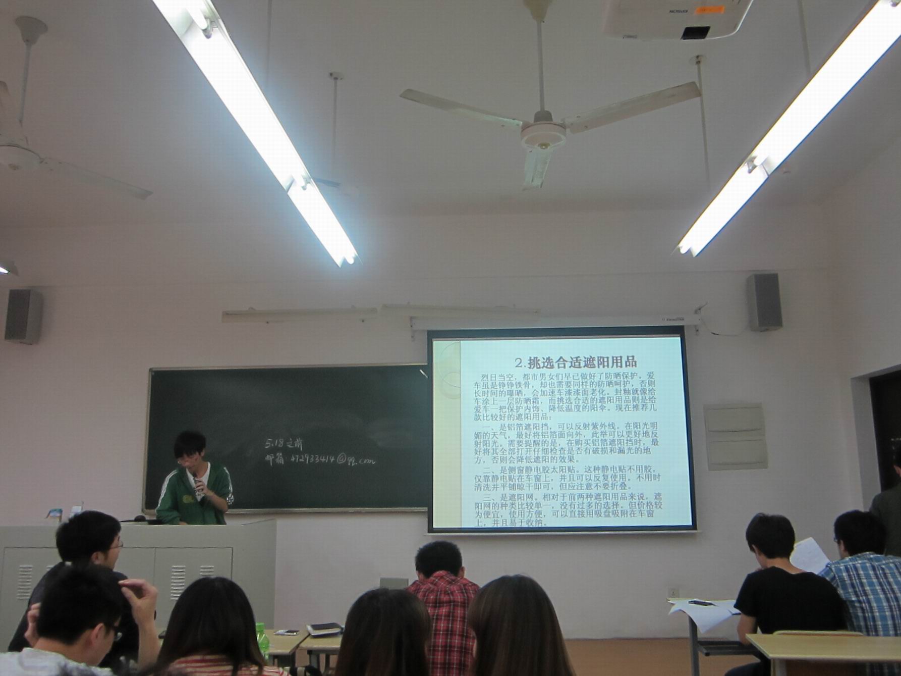在欣赏了精美的汽车图片后,主讲同学为大家介绍了在夏季保养自己爱车的方法以及如何用自己所学的知识解决夏季中常见的汽车突发问题,随后科创部同学向大家讲解了绿色汽车的相关知识,希望大家在炎炎夏日中能正确使用爱车上的空调,为低碳环保贡献自己的力量,讲座在一阵阵热烈的掌声中圆满结束。