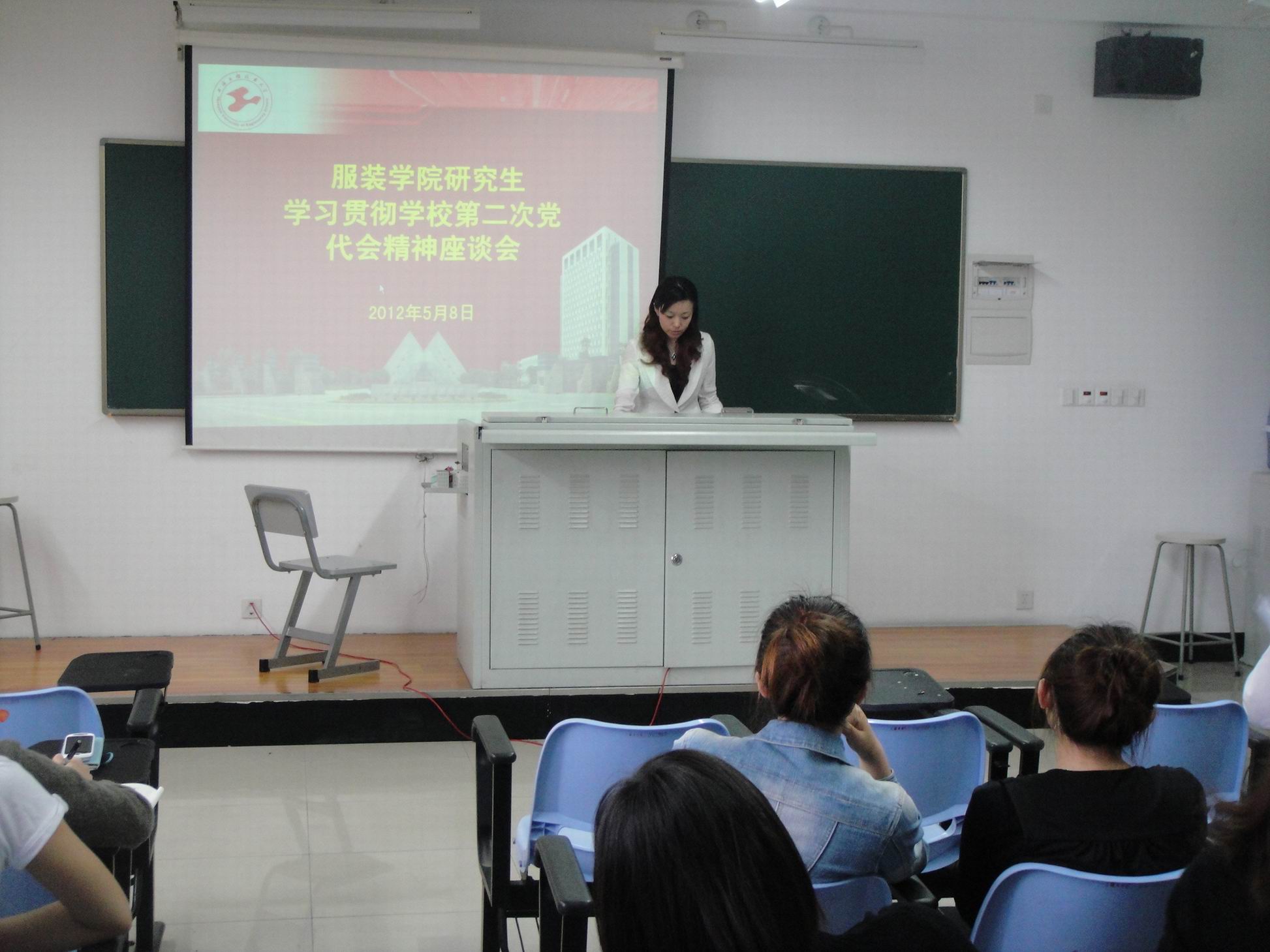 5月8日上午,服装学院在党总支的领导下,学生工作办公室组织全体研究生在艺术楼C310专题学习了《学校第二次党代会精神》,这是继学院全体本科生掀起学习宣传贯彻落实学校第二次党代会精神热潮之后的又一次学习高潮。学院党总支书记袁蓉、副书记李杨和辅导员陈小琼参加了专题学习会。专题学习由袁蓉老师主讲。