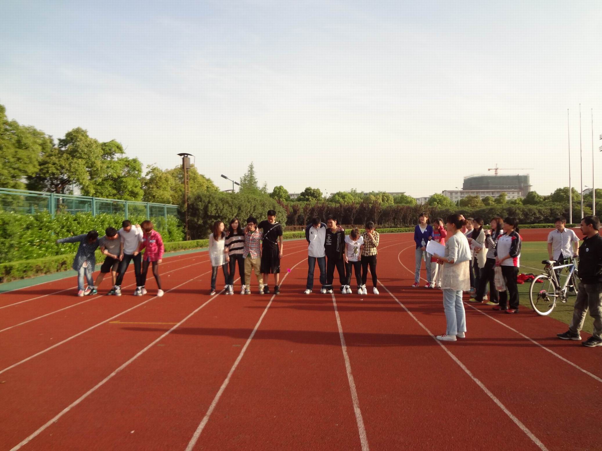 学生们在团支书杨蕾的带领下集合于东操场,两男两女为一组,赛事内容主要分为:四人五足、双人跳绳、踢毽子和4×100接力跑。在四人五足的比赛中,同学们齐心协力奋勇拼搏,为争取更好的成绩而努力,这正是团结一心、积极向上的班级风气的集中体现。双人跳绳打破了以往个人跳绳的单一性与独立性,更好地体现了拉近同学距离的活动宗旨,同学们默契的配合和精彩的表现赢得了阵阵掌声。最后,踢毽子与4×100接力跑也在大家紧张的期盼与热烈的鼓舞喝彩中圆满结束。张贺同学带领的团队获得了“优胜团队”称号;汤佳蓉与来自新疆的少数民族同学麦吾兰,以在踢毽子比赛中的出色表现而获得“最强运动达人”的称号。团支书杨蕾分别为他们颁奖。