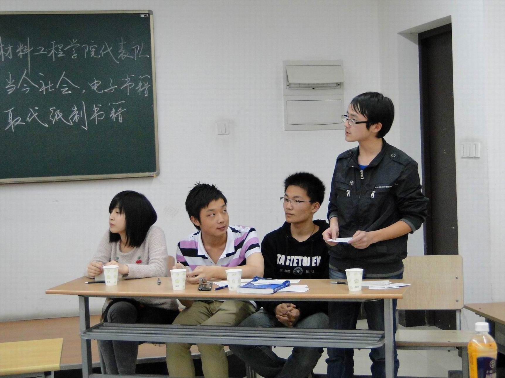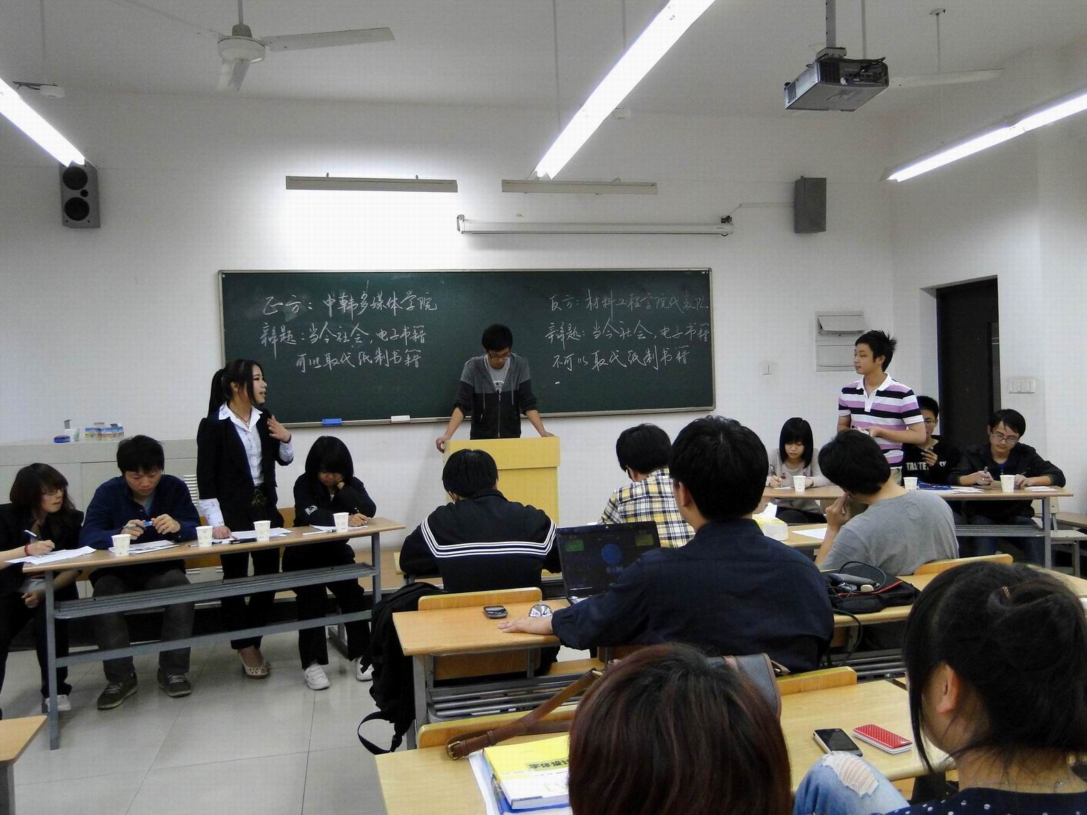 4月26日下午,由校学生会生活部主办的工程大“程睿杯”辩论赛在教学楼E103举行第一轮A组的比赛。参赛双方为材料工程学院和中韩多媒体学院。出席本次辩论赛的评委为汽车工程学院和电子电气学院的辩论赛辩手。