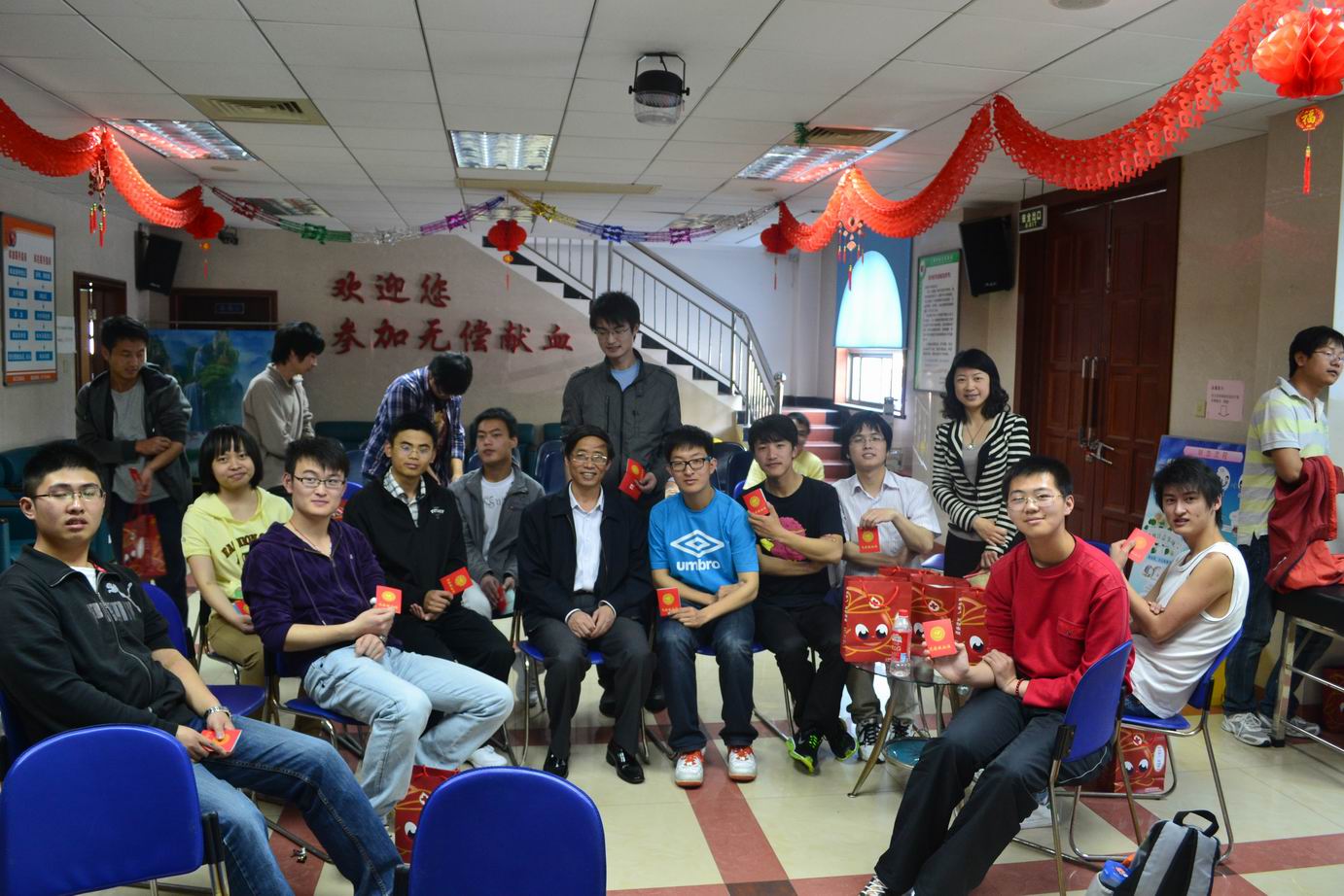 机械工程学院党总支书记刘牧众老师、党总支副书记朱蓓老师始终在现场守候,关心慰问无偿献血的同学,叮嘱大家多注意休息并补充营养。献血活动中处处可见也有带着红色帽子的志愿者,他们大部分是机械工程学院11级的新生。他们或是为献血同学送上一杯温牛奶,或是搀扶献完血的同学一旁休息,或是关心询问献血同学是否有何身体上的不舒服。