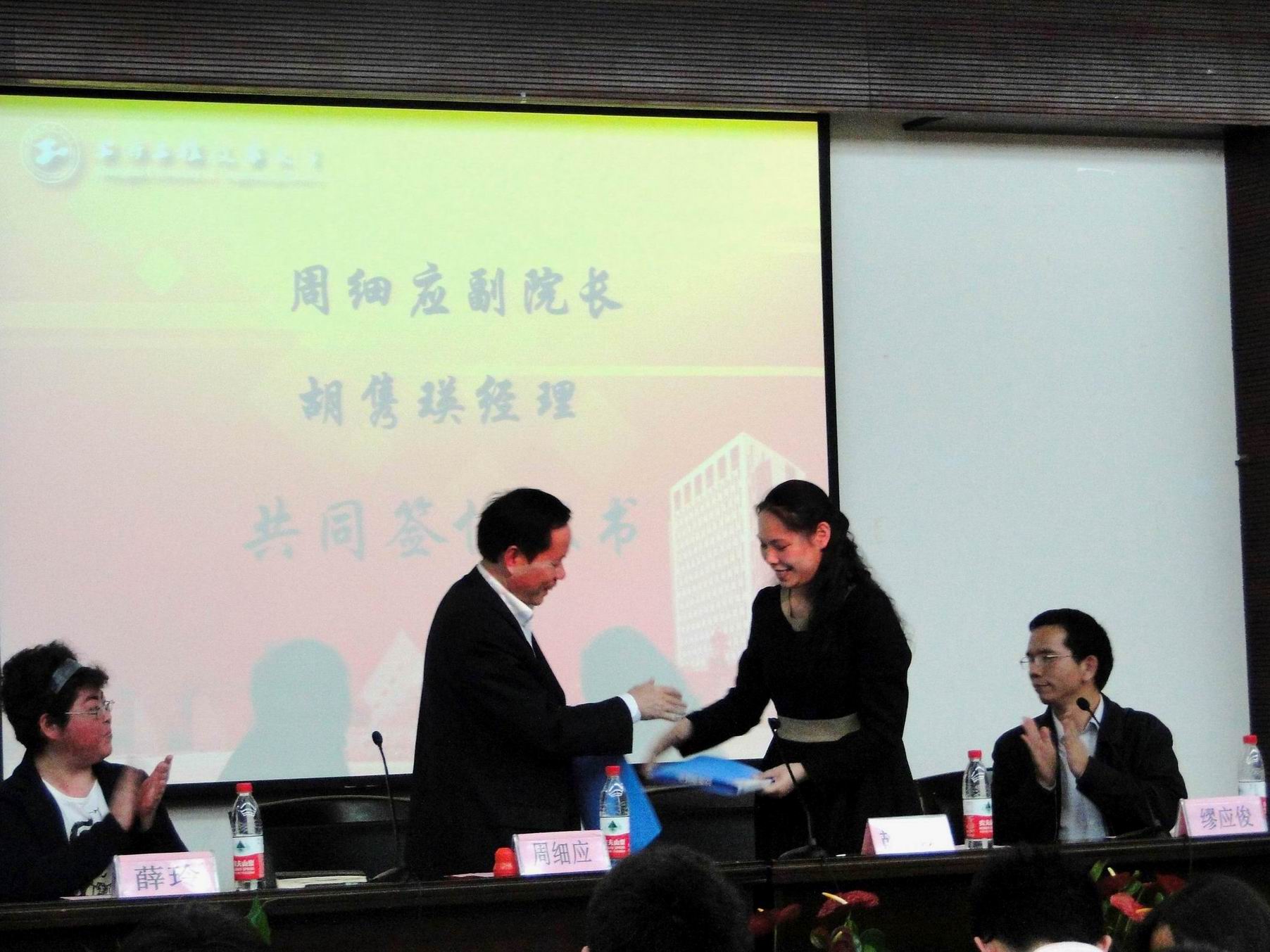 开幕式上,周细应副院长与胡隽瑛经理共同签订了协议书并发表了讲话,周细应副院长指出:创新能力在课堂上是学不来的,通过举办“延锋杯”三维设计大赛,能极大地提高学生们的创新能力,开拓学生们的思维空间。胡隽瑛经理认为在大学里学的知识是在以后深度钻研的基础,学好基本知识,就能在以后的生活工作中发挥重要的作用,学校培养的是勇于创新的人才,这与延锋伟世通汽车模具有限公司与上海工程技术大学合作举办“延锋杯”的目的不谋而合,就是要充分发挥学生的思维创新能力。