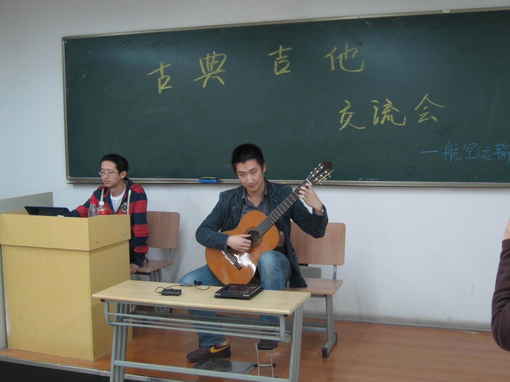 4月18日18:00,航空运输·飞行学院分团委学生会文艺部在教学楼E102举办了一场名为“古典吉他交流会”的主题活动。本次活动很荣幸的邀请到了上海音乐厅演奏家吴平雷老师、古典吉他演奏家谭顺荣老师和张骞老师,他们以现场弹奏结合乐理基础知识的形式让同学们享受了一场“吉他弹奏听觉盛宴”。