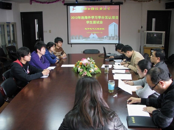 4月1日下午,电子电气工程学院在行政楼912会议室举行赴瑞典和美国交换生选拔面试会。经前期宣传、动员和资格审核, 2010级部分学生参加了面试。学院院长王裕明,院党委书记茅蕾,党委副书记王东阳,副院长史志才、余朝刚担任评委。会议由王裕明院长主持。