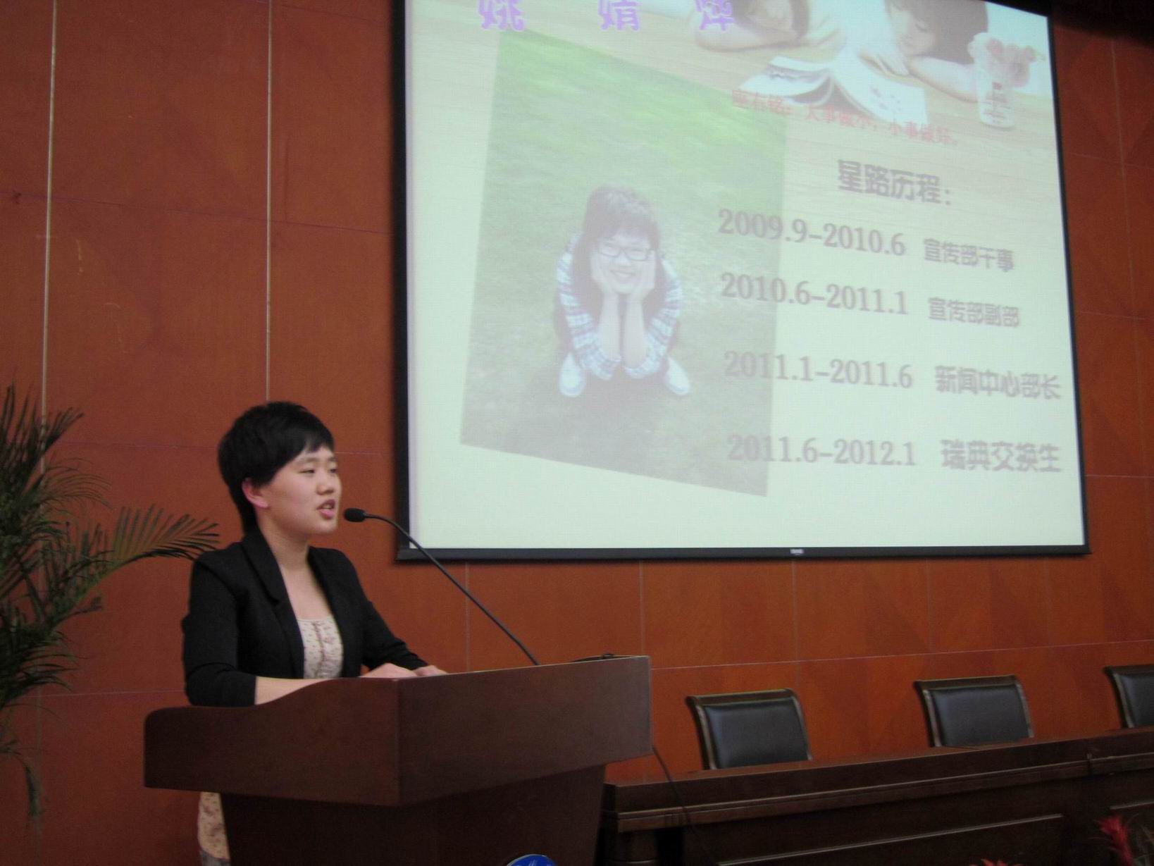 大会开始,首先由戴华胜同学致辞。他对前届的团学联工作给予肯定并表示感谢,并对即将选出的新一届团学联主席团表示祝贺。而后,周凯同学对在任期间的工作做了总结。在简单回顾了“2012建党90周年”、“校风建设活动”、“航空知识讲座季”等系列活动后,他对老师和同学们的支持和贡献表示由衷的感谢。他还说在他任职的那494天里,团学联活动能有序、完满开展离不开同学们的工作热情。他希望同学们能继续以工作热情为第一要务更好地为学院和团学联服务。在谈到对学院的未来展望时,他表示团学联现在在团队凝聚力、品牌效应等方面还有所欠缺,希望这届当选人能接过他的接力棒,在上述方面做出更大的改善。