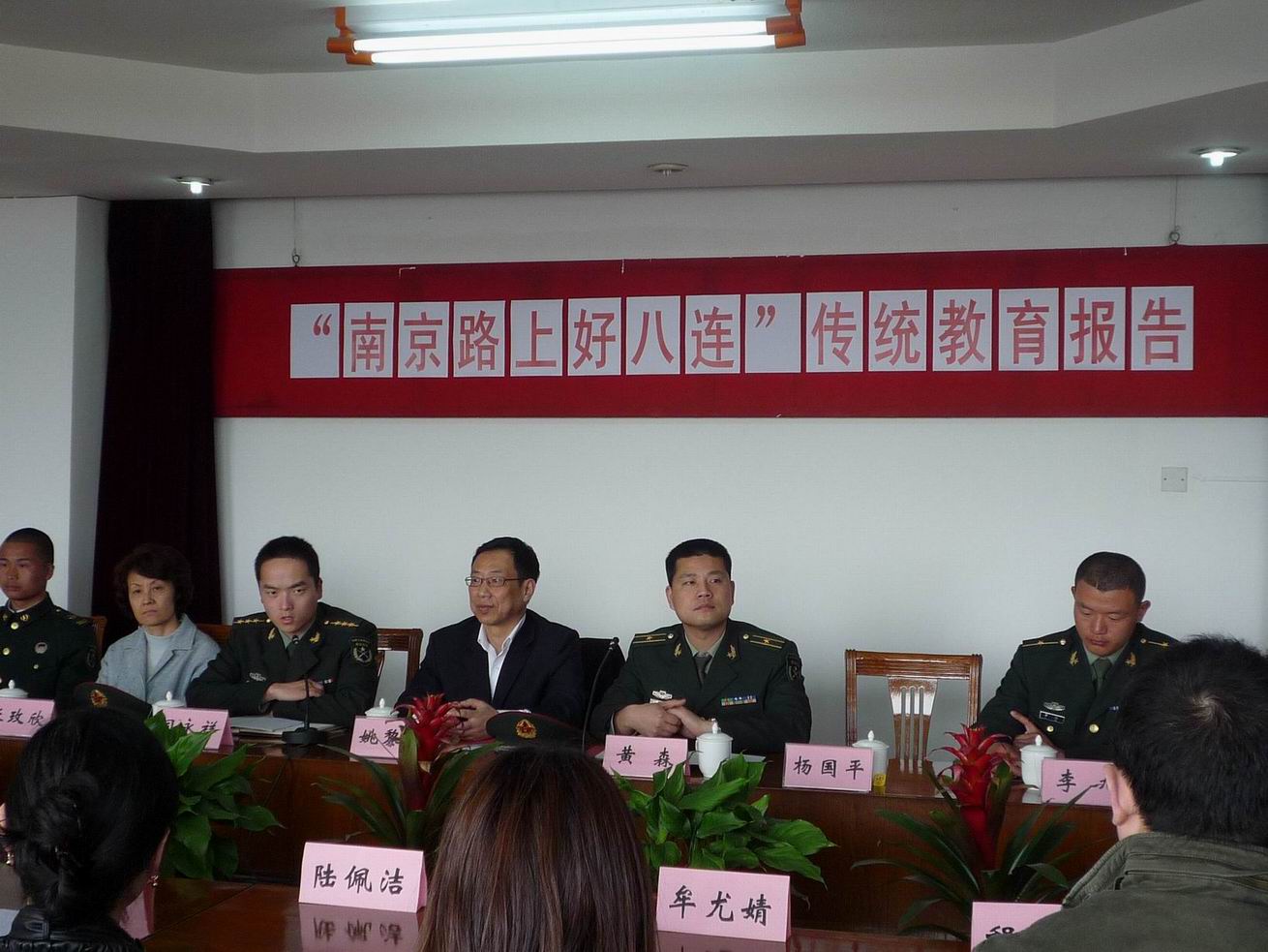 会上,“南京路上好八连”指导员闫永祥做了好八连传统教育报告。“南京路上好八连”有着将近50年的优良传统,“意志坚”、“为人民”、“拒腐蚀”是“好八连”典型精神体现,曾经受到毛泽东、邓小平各两次,江泽民三次,胡锦涛主席四次接见。闫永祥指导员深切讲述了前不久受到胡锦涛主席接见的情景。