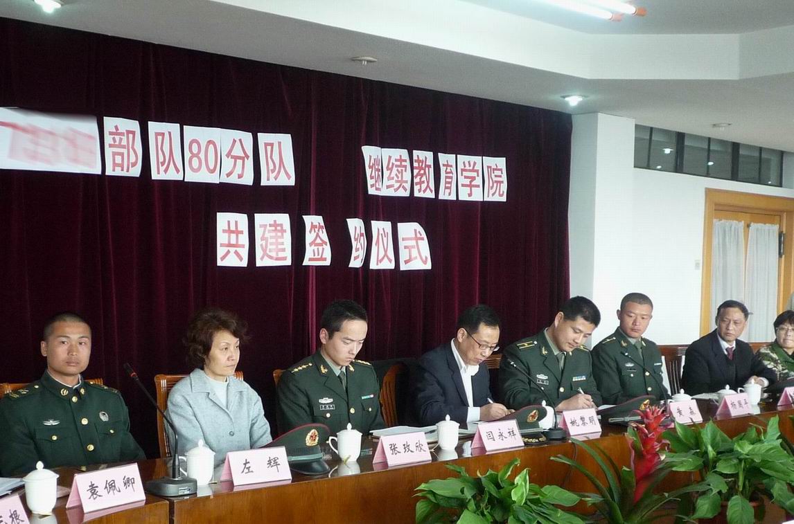 部队首长黄森在会上发表了讲话,他指出学院注重师生的德育教育并在争创优先的活动中积累了很好的经验,感谢继续教育学院提供了这么宝贵的学习机会。“好八连”也会将沉淀的优良传统,与学院的特点进行优势互补,共建活动,共建双赢。希望通过大家的努力让“共建之花”开得更加鲜艳。学院党总支书记姚黎明感谢“好八连”送宝上门。“好八连”是全军全国人们的学习榜样,“好八连”艰苦奋斗,拒腐蚀永不沾,全心全意为人民服务的精神具有深刻的现实意义。与“好八连”共建对于推进目前开展的价值取向大讨论、学院“党员导师计划”和学习型组织建设,拓展学院服务社会,提升学院党建和文化建设都具有重要意义。姚黎明院长寓意“共建”是学院在春天播撒的种子,经过师生领导和官兵干部的共同努力,将来一定会收获丰硕的成果。