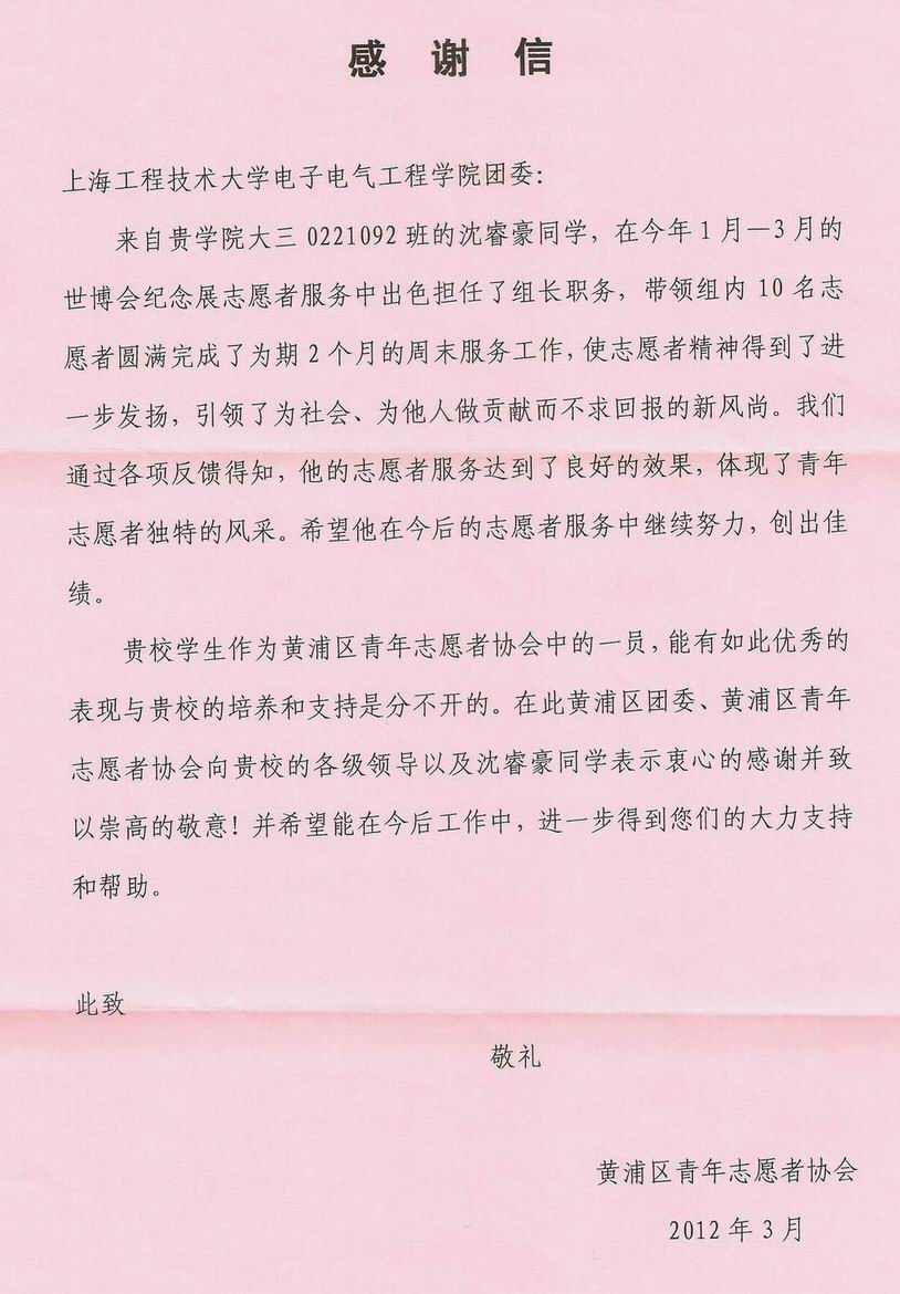 近日,电子电气工程学院收到了来自黄浦区青年志愿者协会对自动化(汽车电子)专业0221092班沈睿豪同学的表扬信。