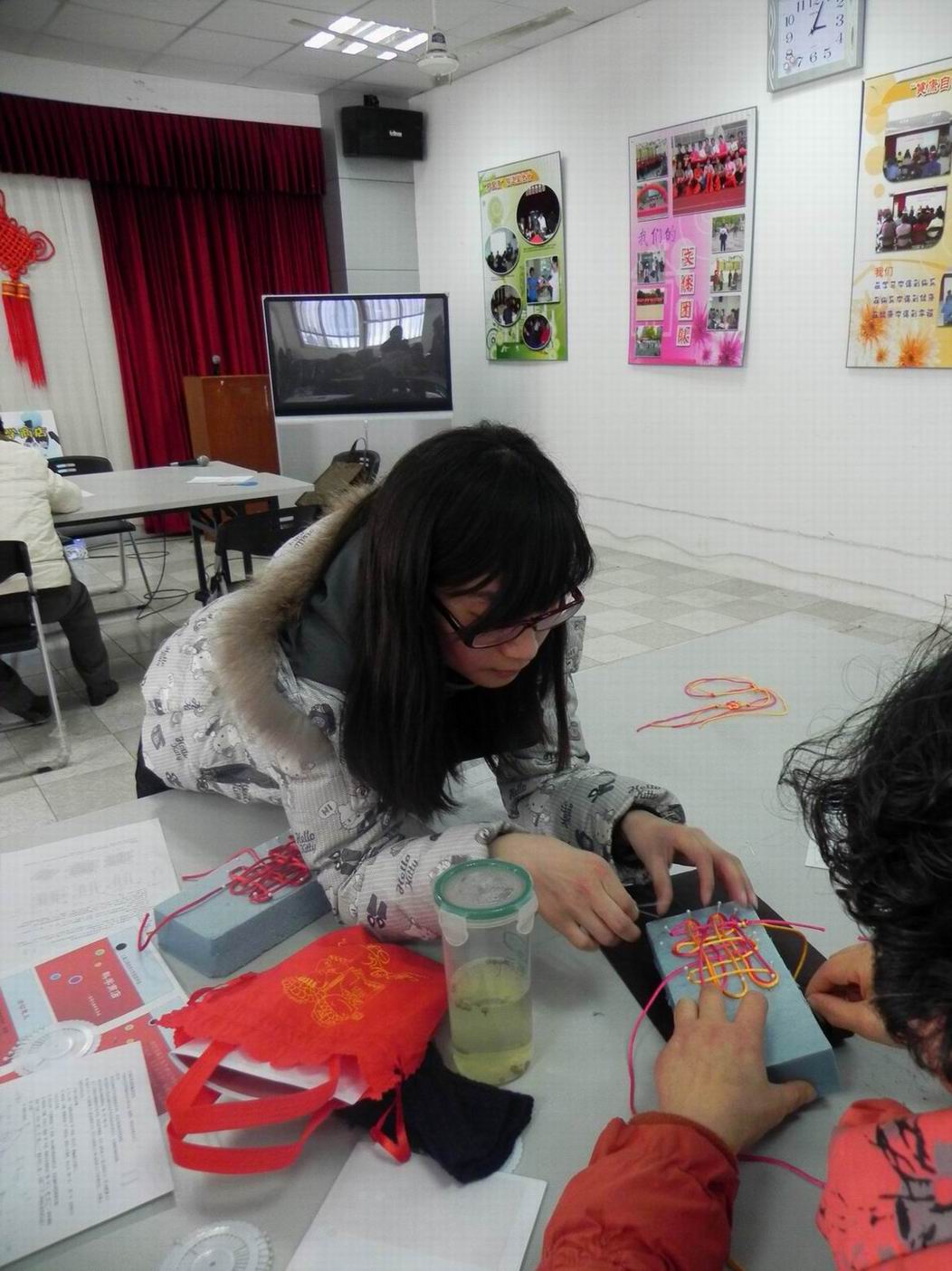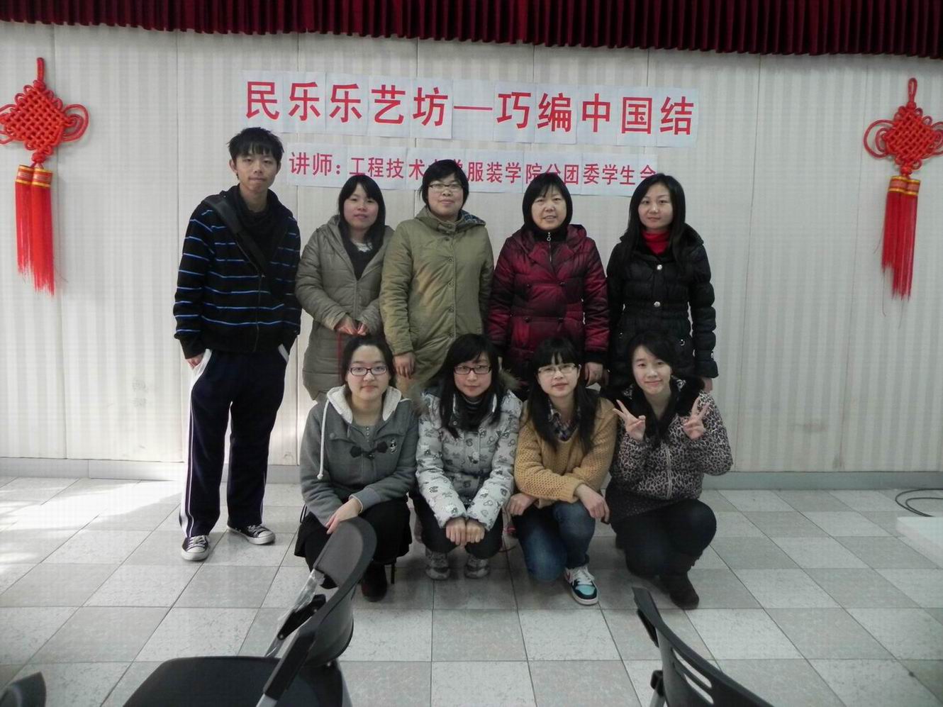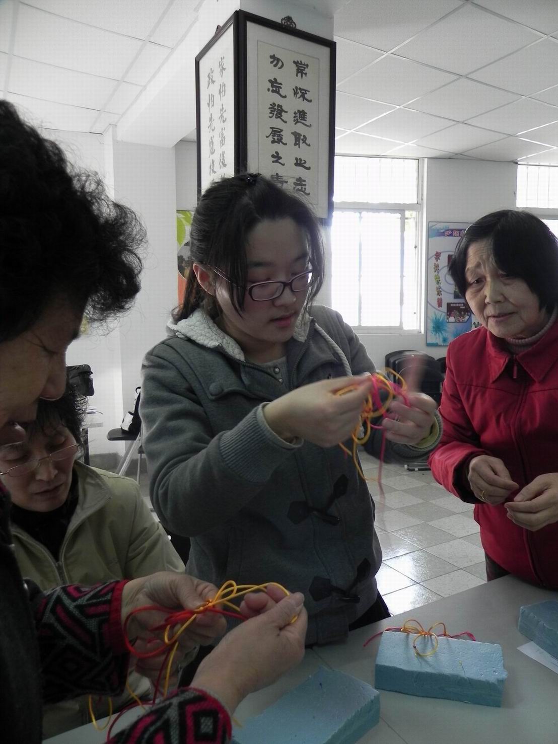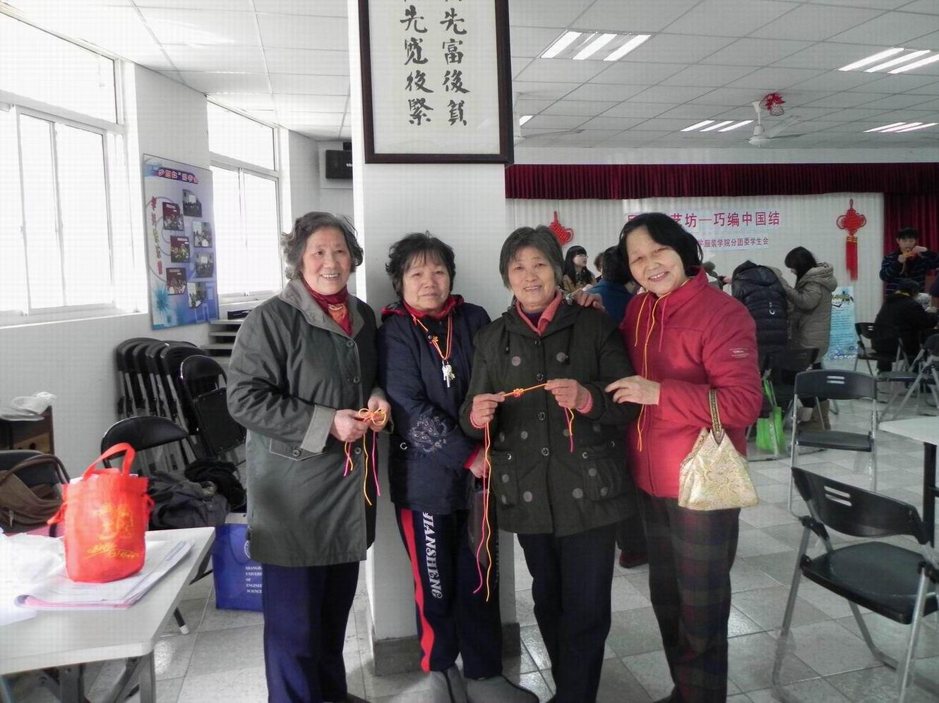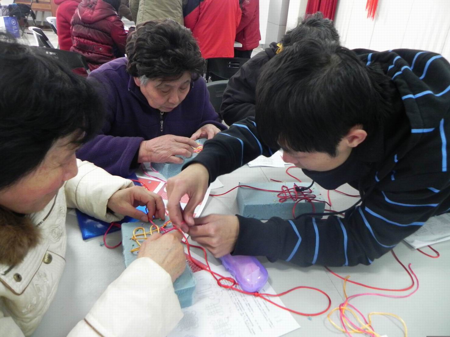 3月21号下午,服装学院科学商店成员一行5人来到对接单位——松江区岳阳街道民乐社区服务中心,与社区内的居民朋友们一同开展了“编制中国结”手工编织活动。