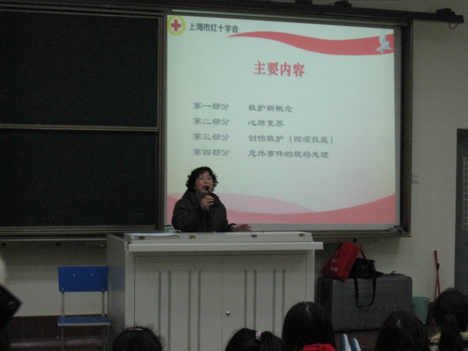 3月5日、6日下午18:00,高职学院邀请江湾街道医护人员在综合楼108教室为全体11级学生举办了两场现场初级急救普及培训。培训的内容大体分为救护新概念、心肺复苏、创伤救护、意外事件的现场处理四个部分。