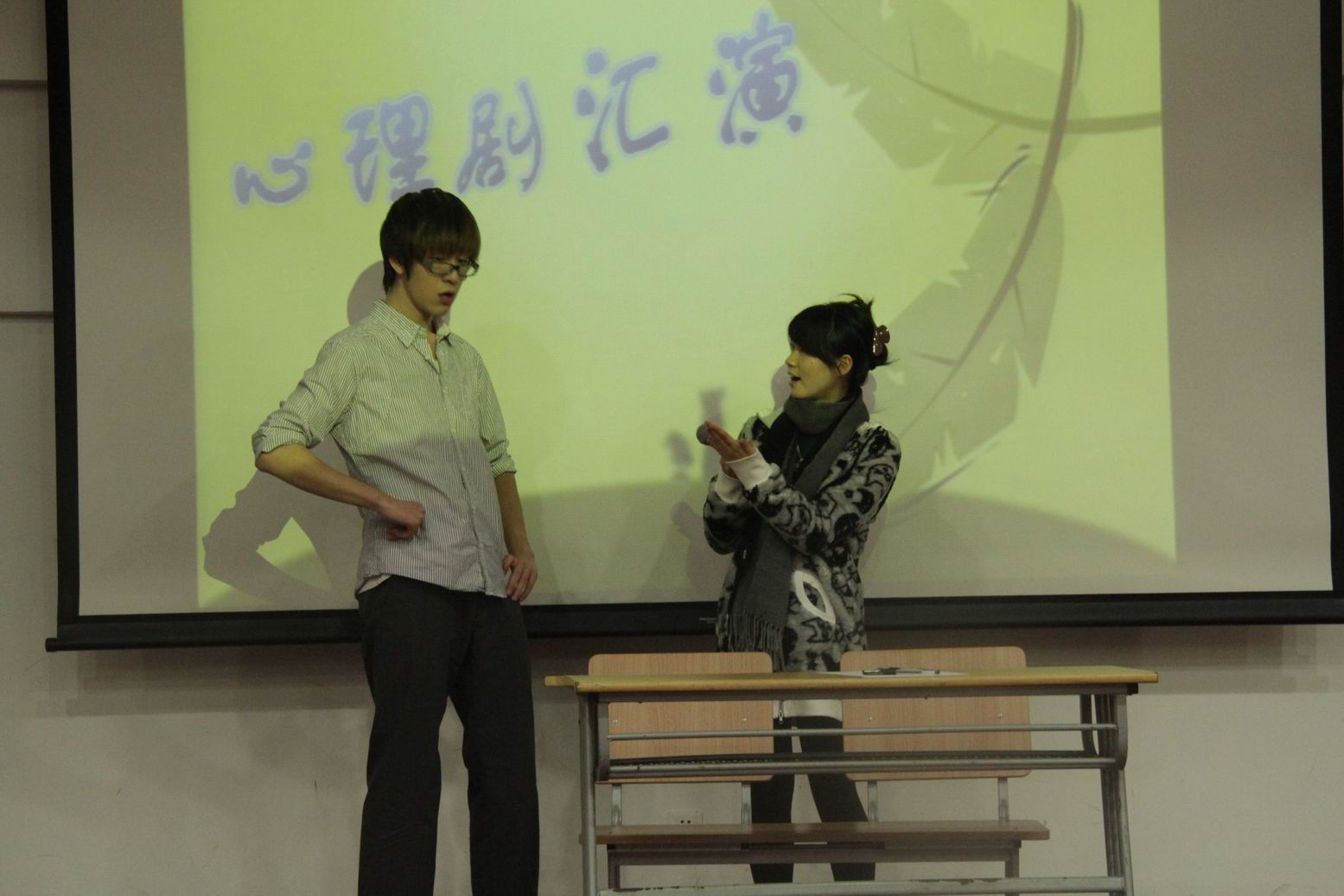 12月13日晚上18:00,在电子电气工程学院和中法埃菲时装设计师学院联合主办的心与心,零距离颁奖晚会上,中法埃菲时装设计师学院朋辈互助站剧团向松江校区的师生汇报演出了《我的大学》和《因为有爱》两出校园心理剧,真实生动地展现了大学生在进入大学以后的迷茫期以及大学生如何面对领养家庭的困惑两个主题.精彩的演出博得了在场师生的阵阵掌声。