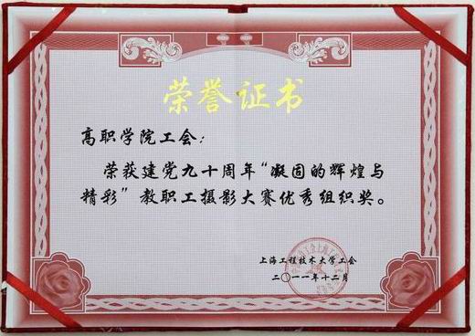 为表达教育工作者对中国共产党建党九十周年的祝福和热爱之情,同时展示教职工积极向上的精神风貌及摄影艺术才华,高职学院工会组织参加了由校工会主办、艺术设计学院工会承办的“凝固的辉煌与精彩”摄影大赛,经过评审工作小组综合评审,高职学院工会荣获建党九十周年“凝固的辉煌与精彩”教职工摄影大赛优秀组织奖。
