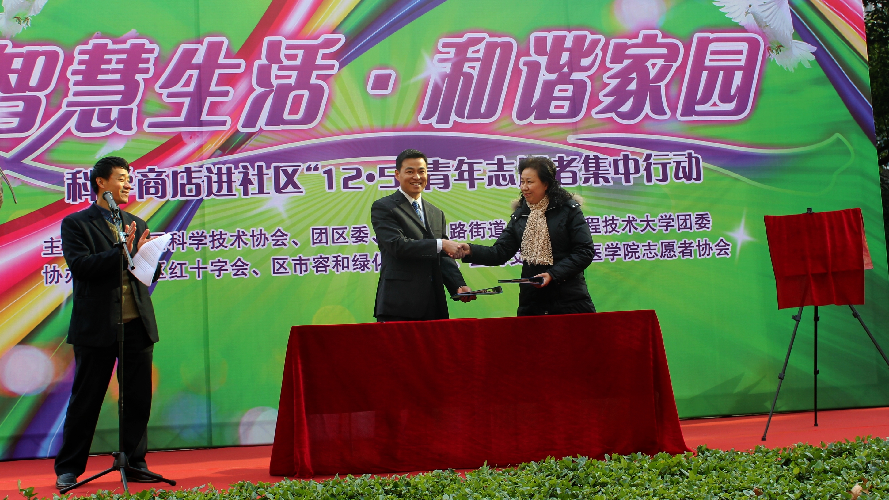 122下午,“智慧生活 和谐家园”——科学商店进社区12·5青年志愿者集中行动暨上海工程技术大学科学商店淮海街道门店成立仪式在淮海公园前广场隆重举行。团市委志愿者工作部部长张恽、区科学技术协会联合筹备组组长龚蓓敏、团区委联合筹备组组长顾定�]、上海工程技术大学团委书记茅华伟、电子电气工程学院党委副书记王东阳、淮海中路街道副调研员陈国梅等领导出席活动。