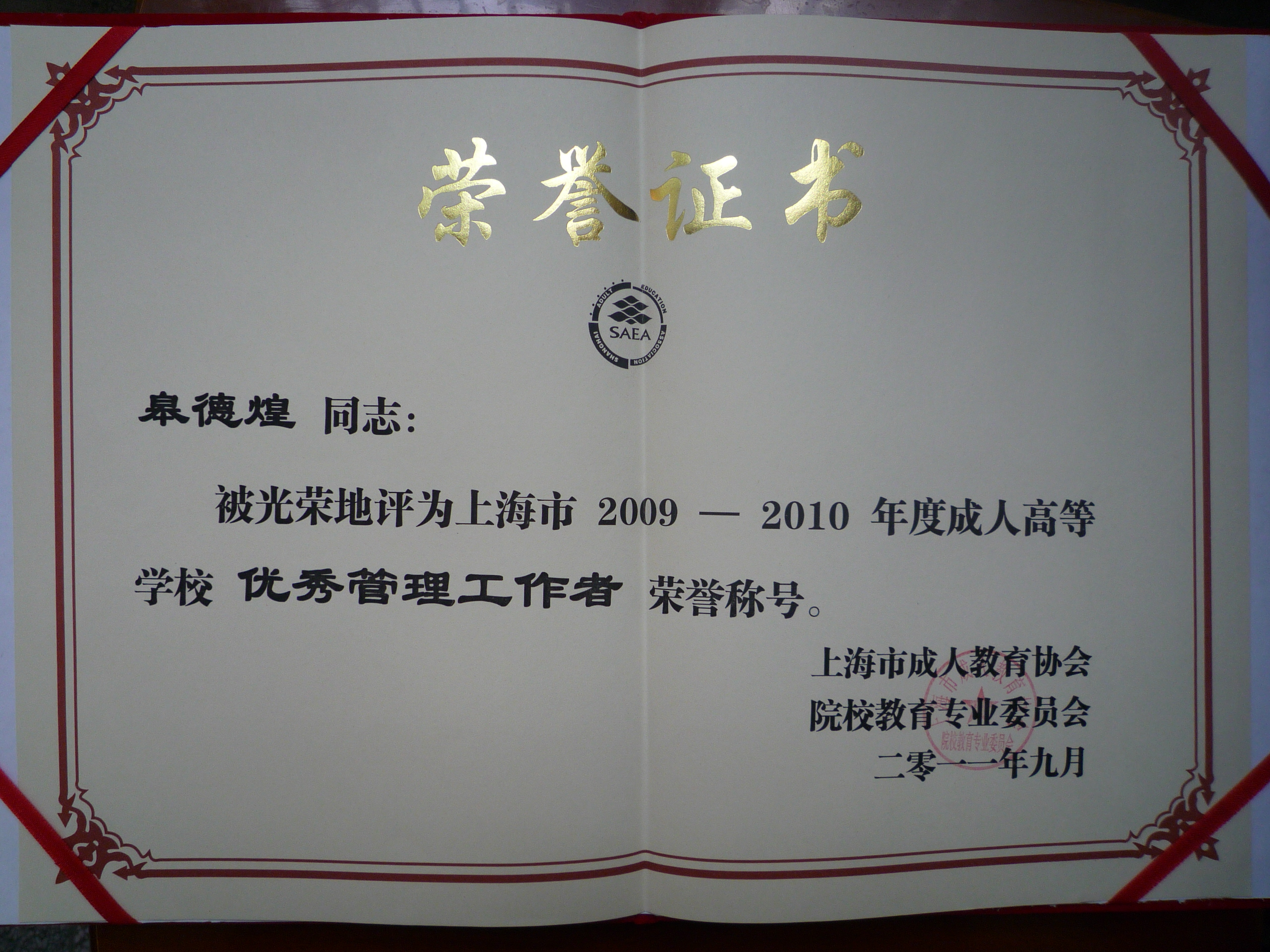 为进一步提高上海市成人高等教育的教学质量,鼓励教师和管理人员积极拓展成人教育教学研究、教学改革和教学管理水平,鼓励学生积极进取、勤奋学习,上海市成人教育协会、院校专业评审委员会开展了2011年度上海市成人高校优秀管理工作者、优秀教师、优秀班主任、优秀学员评比活动并召开了表彰大会。