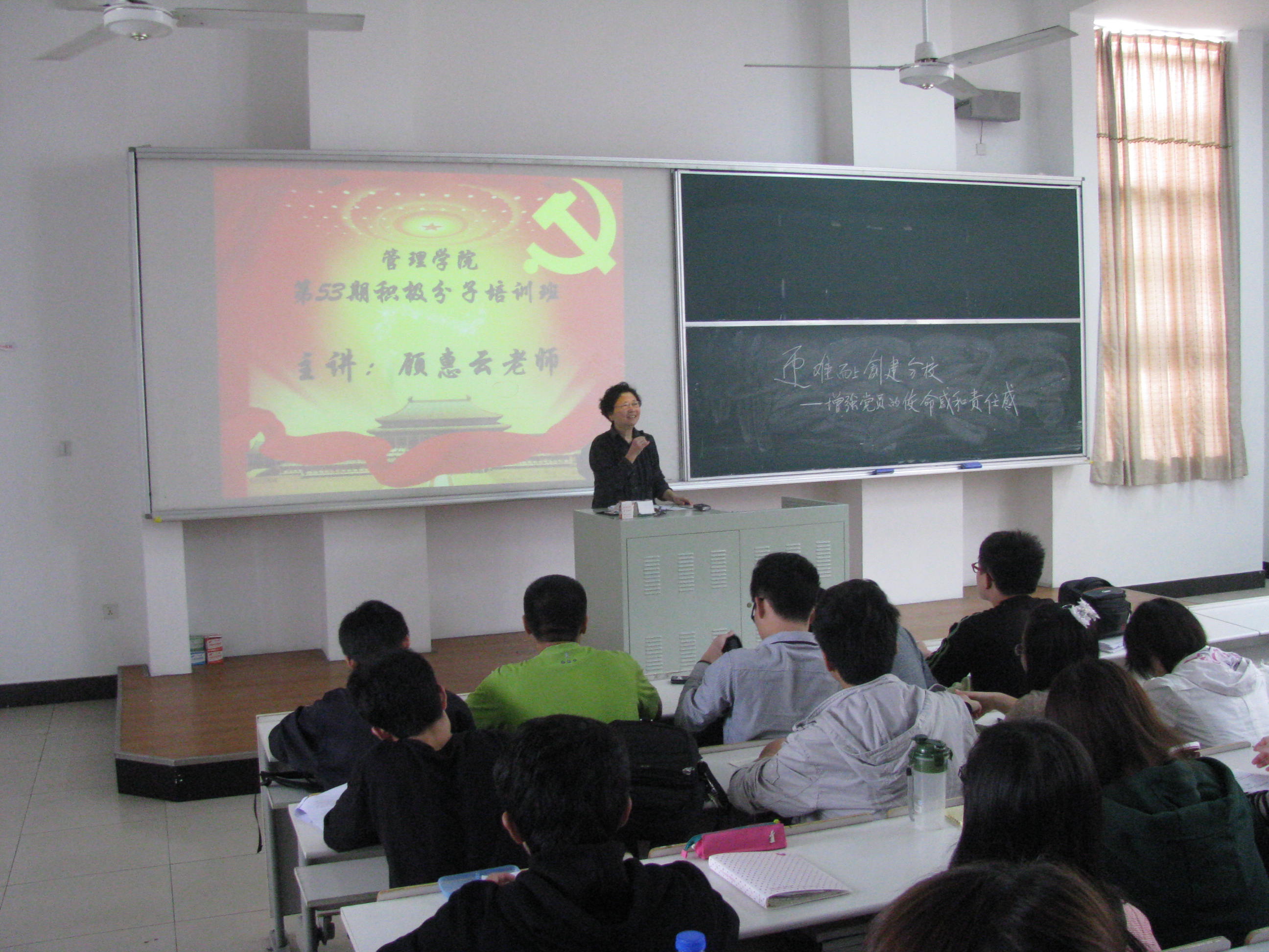 1118中午1230分,管理学院第53期党的基础知识培训班在教学楼E218举行了第五讲课程的授课,此次培训邀请到了我校的退休党员、原学生处处长顾惠云老师来为入党积极分子进行授课,管理学院党委副书记虞蓉老师出席。