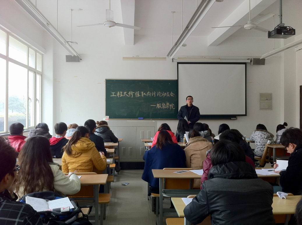 313下午四点半,服装学院学生会在教学楼召开工程大价值取向讨论会。会议由服装学院分团委副书记陆秀萍主持,分团委书记沈智莉老师参加会议。