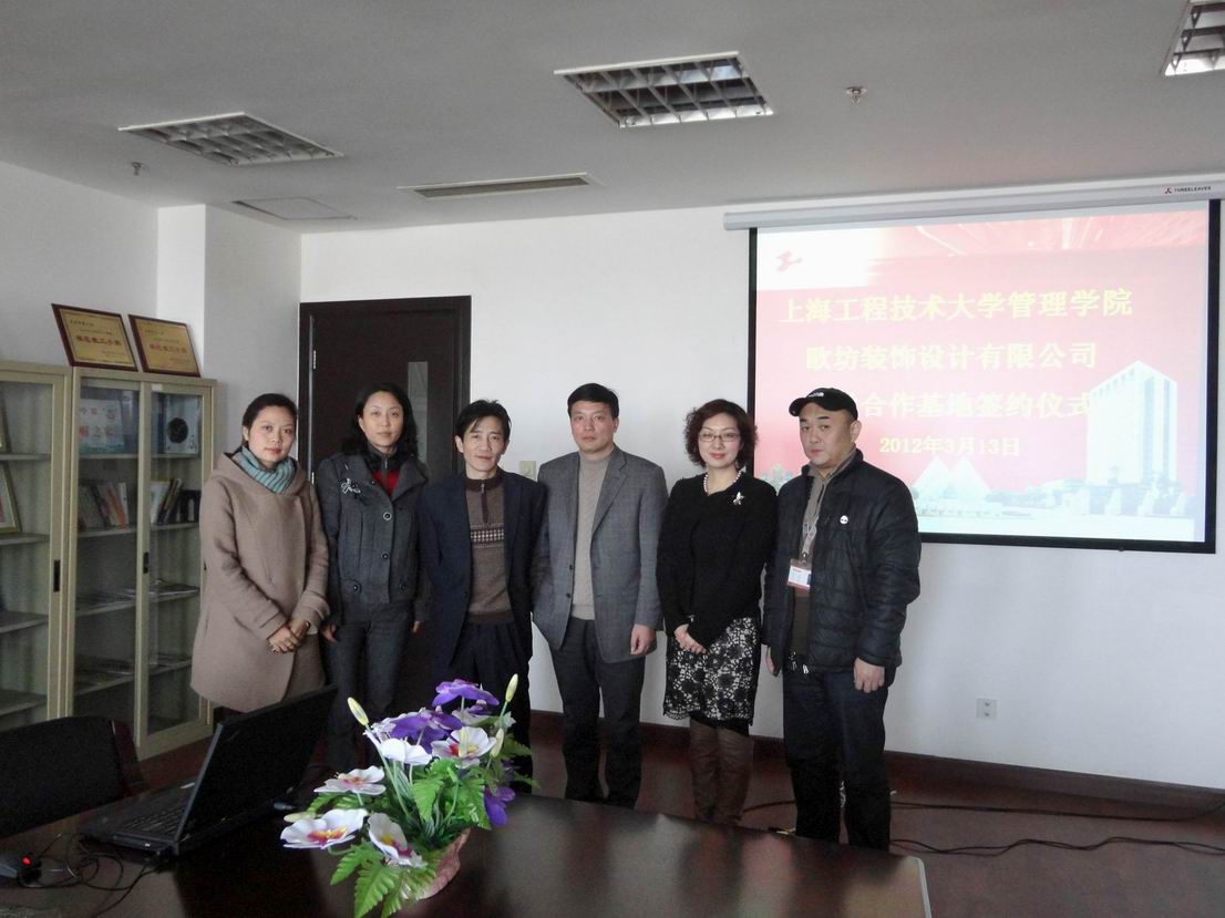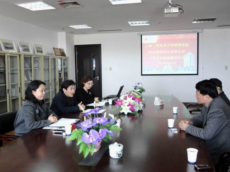 为积极推动学院开展产学合作及预就业工作,2012313日下午13:00,管理学院与上海欧坊装饰设计有限公司在行政楼612举行了产学合作教育基地签约仪式。管理学院常务副院长吴忠、教学副院长邱羚、院党委副书记虞蓉与上海欧坊装饰设计有限公司郭锡军总经理一行出席了签约仪式,辅导员白玉新老师与部分学生代表参加了此次会议。