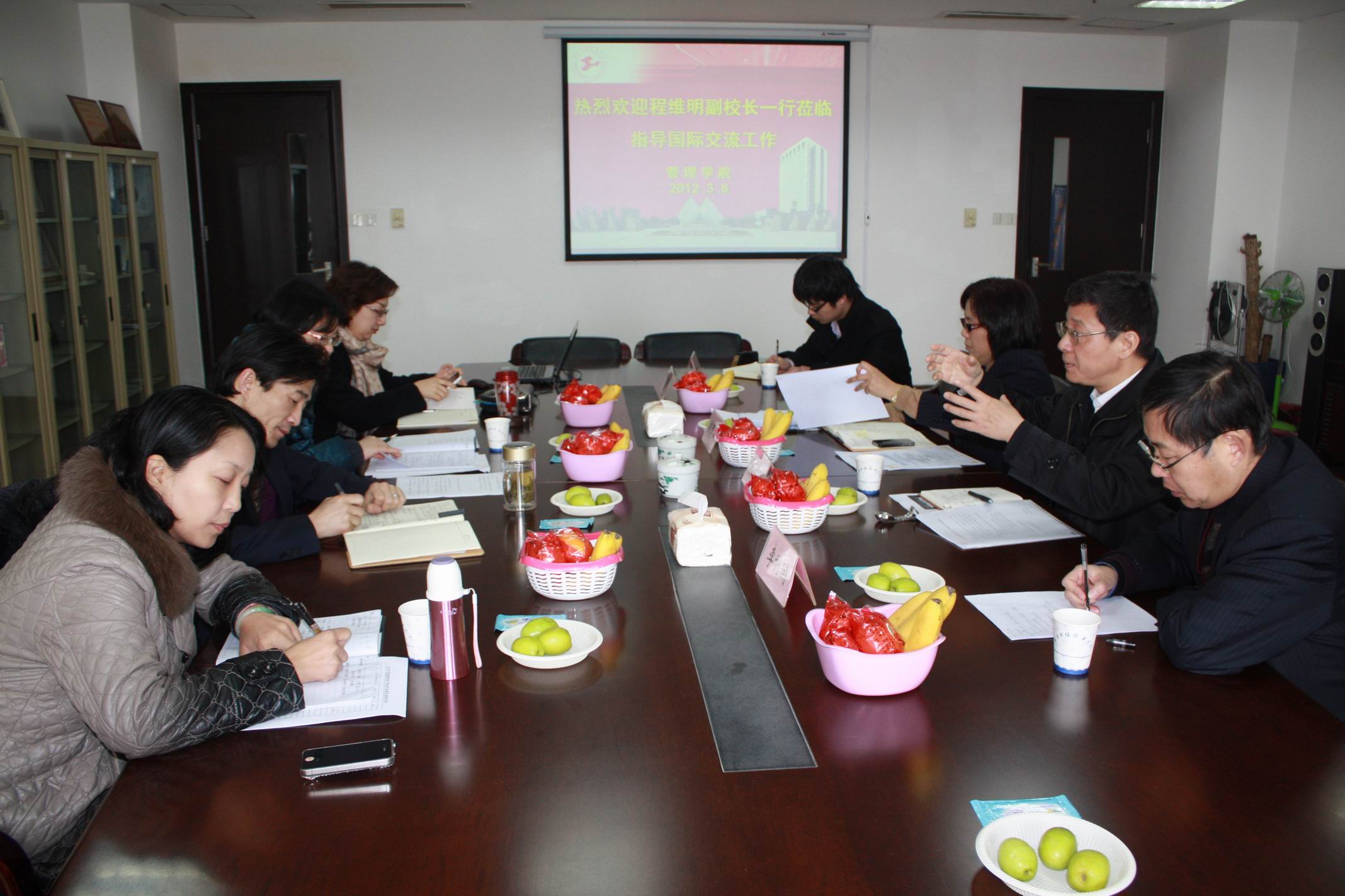 在随后举行的交流会上,程维明副校长首先听取了常务副院长吴忠老师对学院近几年国际交流工作情况和“十二五规划”中对国际交流工作前景规划的汇报。之后,程维明副校长仔细询问了对我院学生出国交流人数、交流的主要形式、教师交流与合作等情况,并对管理学院国际交流工作给予了肯定,希望管理学院今后应加大在课程设计、引进外籍教师、同国外大学的合作办学力度,尤其是要将这种合作从学院层面延伸到学校层面,加强同国外大学的交流和科研互作。