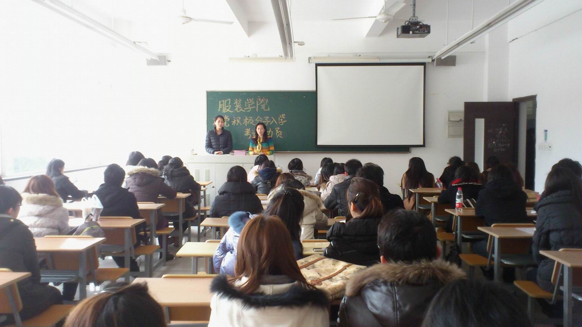 2012227中午1220分,服装学院在教学楼D114召开第五十四期入党积极分子党课入学考试动员大会,服装学院组织员郑艳、学生第一党支部书记邬�t洁、研究生党支部书记陈小琼以及服装学院全体参加党课培训的学员参加了此次会议。