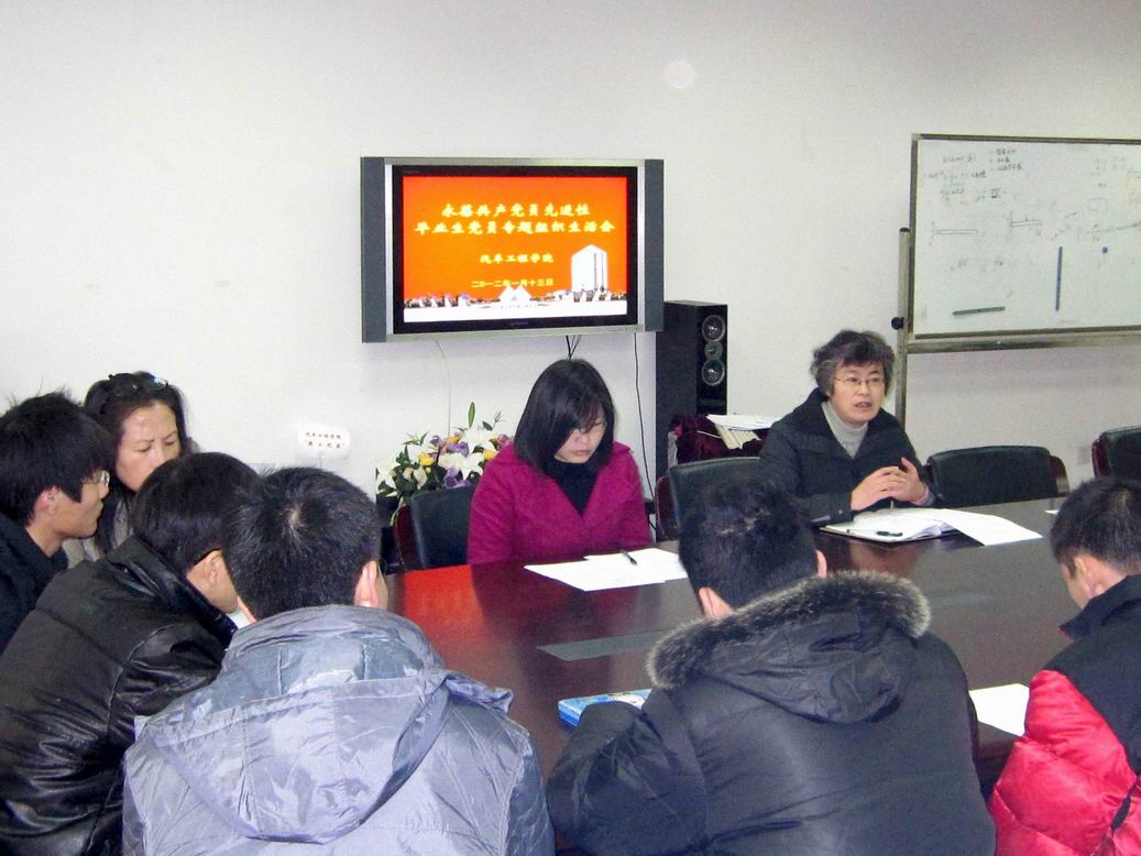 20121138:00,汽车工程学院在行政楼10楼汽车工程学院会议室举行了2012届春季毕业生党员组织生活会。汽车工程学院党总支书记周洁老师、党总支副书记段海霞老师和各支部书记出席了此次活动,活动由段海霞老师主持。