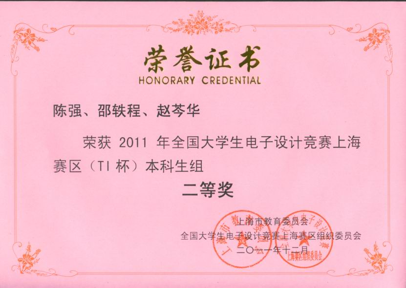 近期,我校电子电气工程学院共5个竞赛小组在复旦大学举行的“2011年全国大学生电子设计竞赛(上海赛区TI杯)”颁奖典礼上获奖。其中,在上海赛区(TI杯)获奖名单中,我校电子电气工程学院0221091 班邵轶程、0221091班陈扬所在的2个竞赛小组荣获上海赛区二等奖,0213082班朱骏驰、0212091班黄敏、0231091班姚宏杰、0213101班张清波所在的竞赛小组共4组荣获上海赛区三等奖。本次竞赛共有来自上海19所高校的235支参赛队报名参加,参加学生人数为705人。