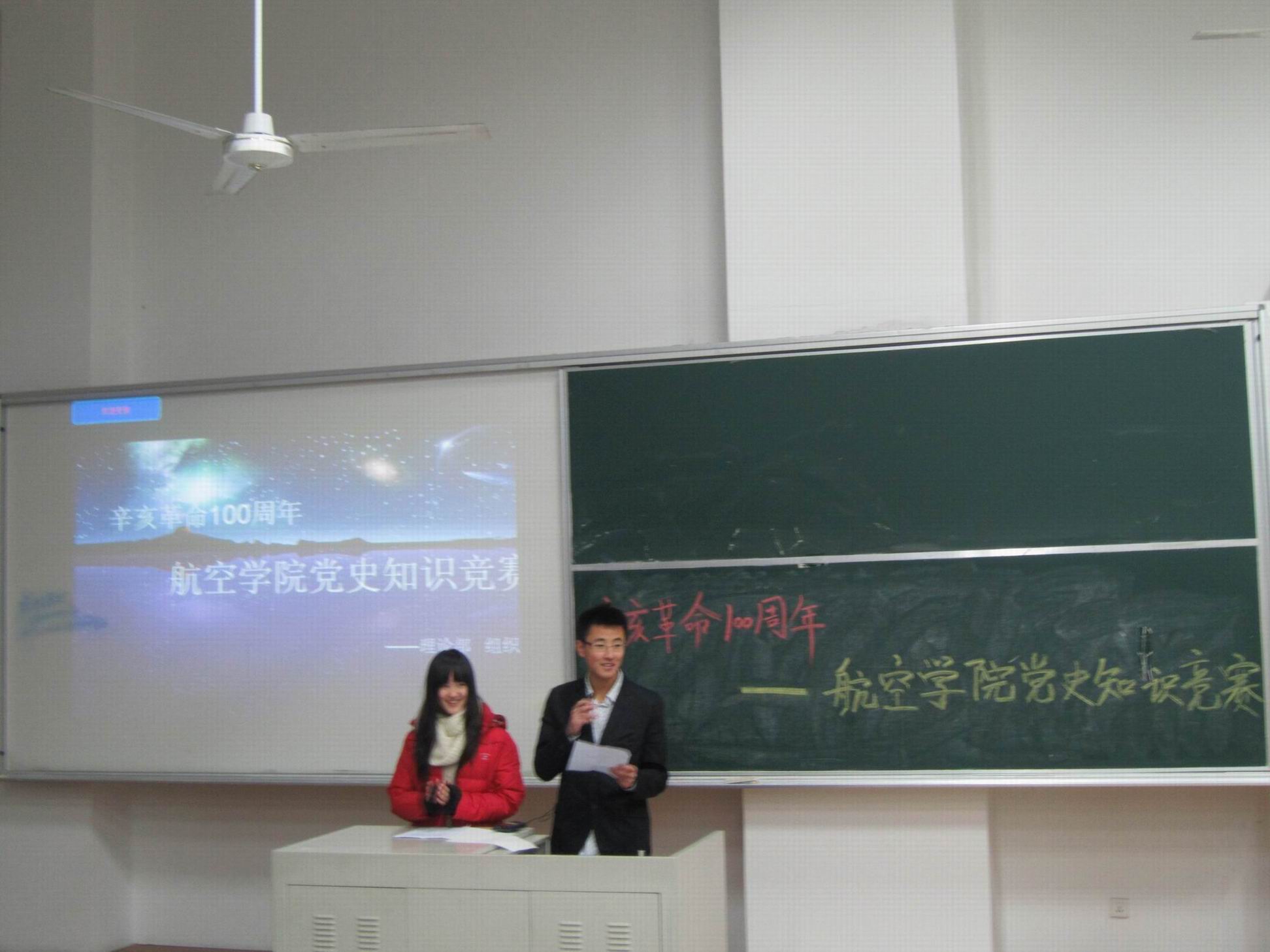 为庆祝辛亥革命100周年,12月26日晚18:00,由航空运输•飞行学院分团委组织部与理论部合办的“党史知识竞赛”决赛在教学楼F320举行。