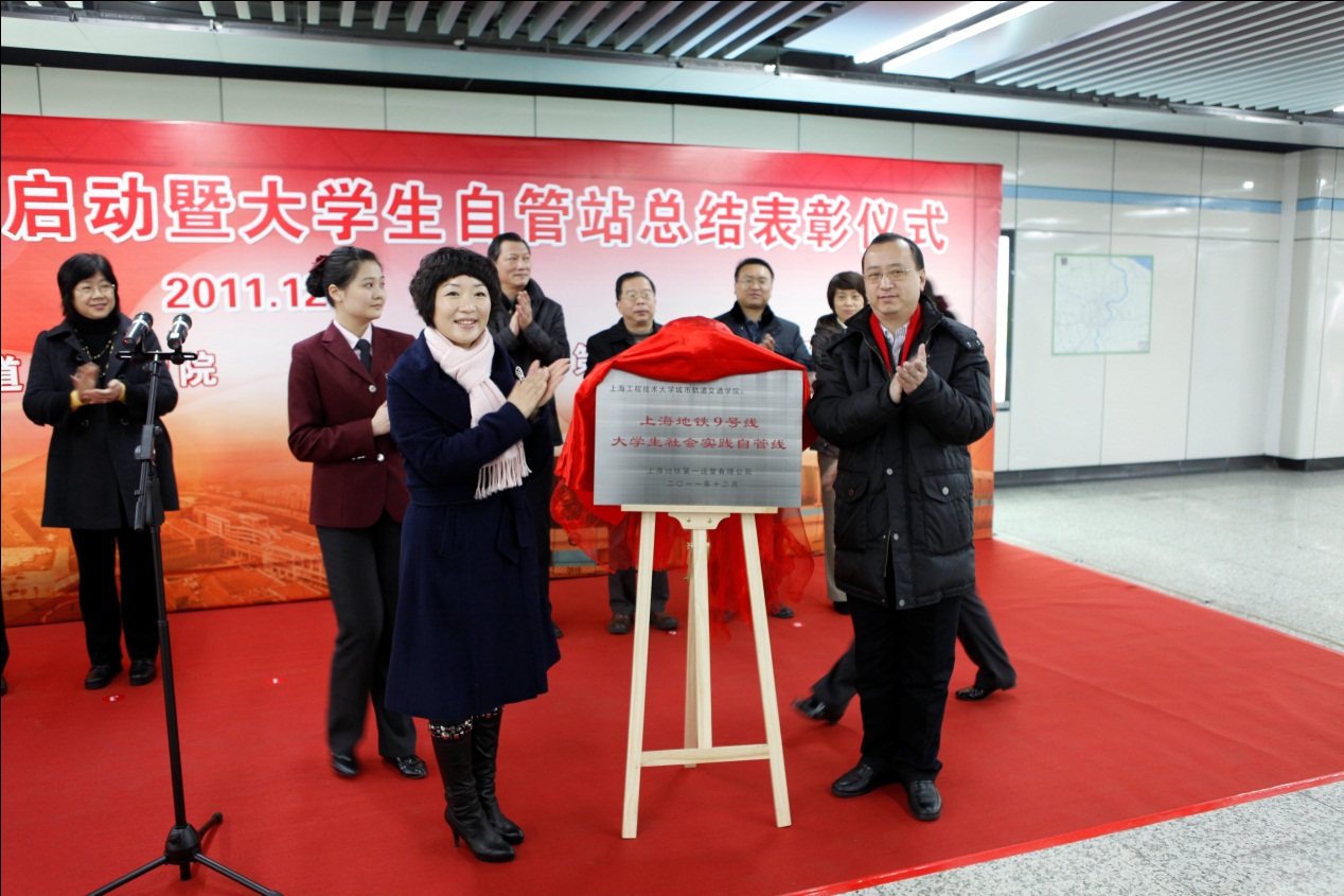 上海工程技术大学宣传部部长王一川与申通地铁集团党办副主任吴昕毅共同为“9号线大学生自管线”揭牌