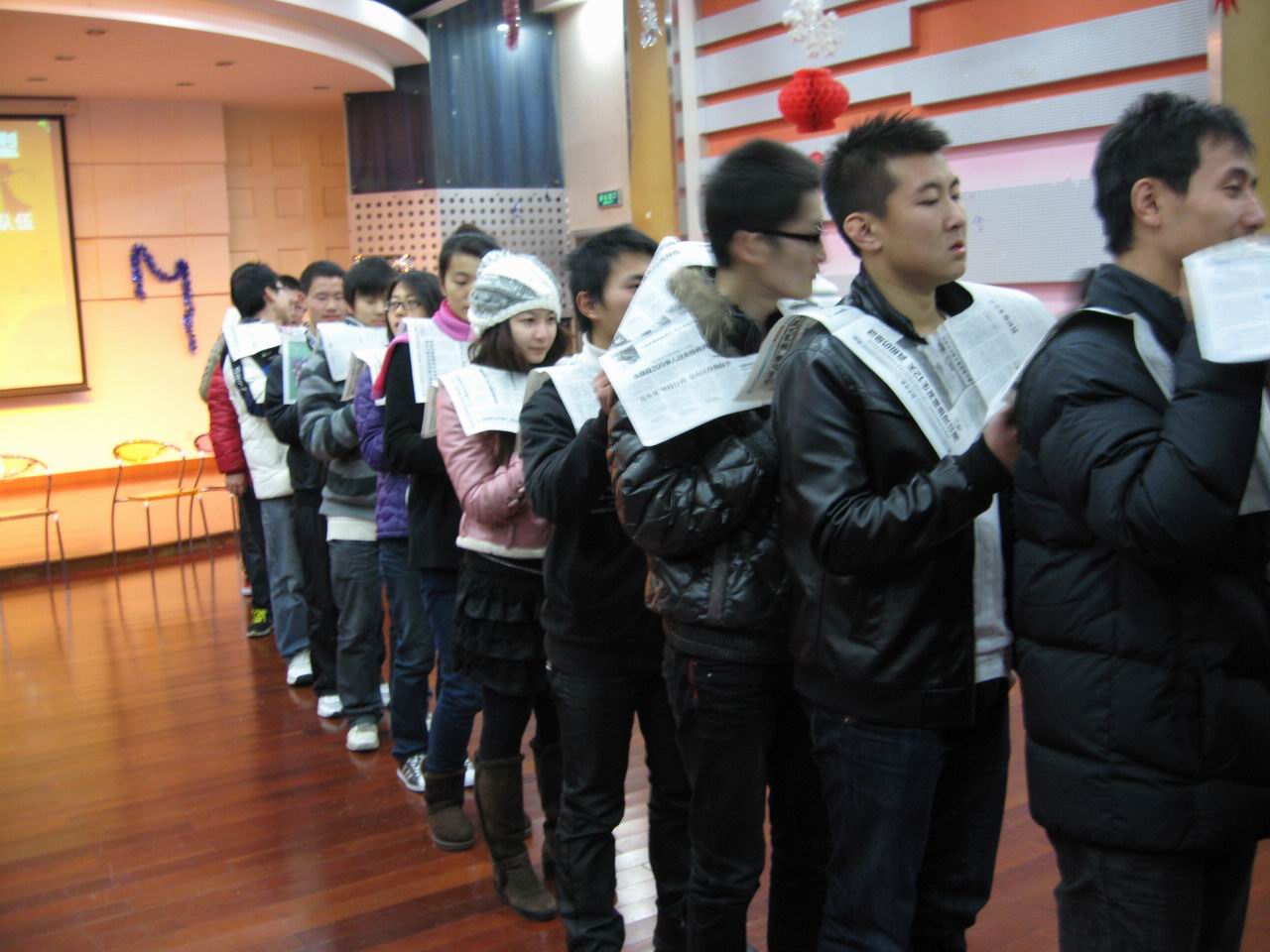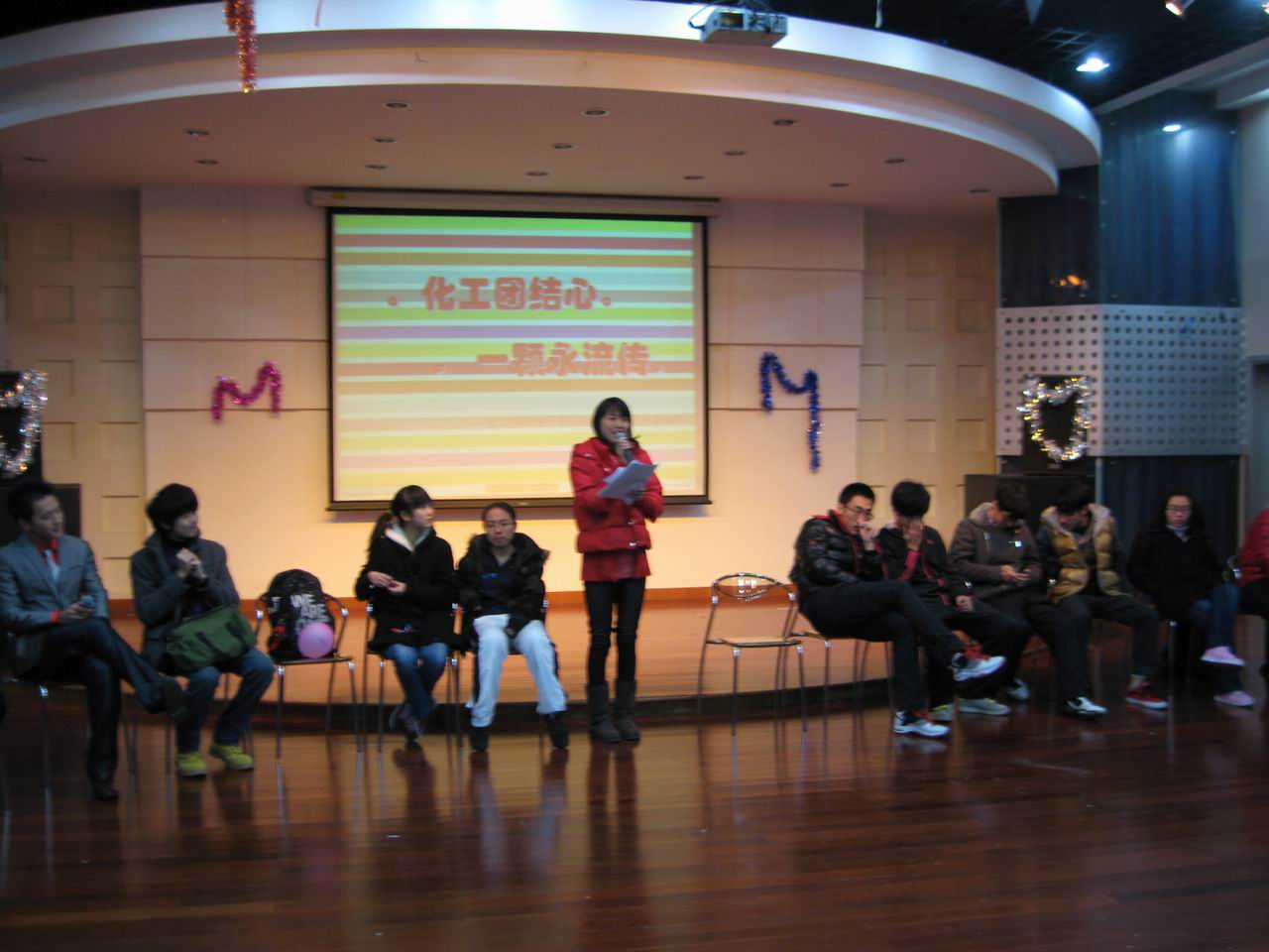 晚会一开始便浸润在温馨的气氛中,干事们在舞厅环绕而坐,充分体现干事们心连心和化学化工学院团委学生会的凝聚力。组织部部长成���醋魑�主持人,组织现场的干事们进行随机分组,待四组ABCD分好后,开始游戏。游戏以象征各部门特点的蝴蝶结作为记号,使在场的干事们很快就通过简单的方式了解同组的同学,众干事积极参加,撕报纸�p接环�p毛线球织网等有趣的游戏,吸引了在场的所有人,欢笑声不时回荡在舞厅中。孙一博,位超等几个部长相继发言总结本学期的工作,并献上了对干事们的鼓励和祝福。学术部部长彭之超虽未到场,但他写了一封饱含深情的信,由刘��羽当场深情朗读,他在信中对学术每个干事都送出了祝福,在场的所有干事都非常感动。最后各部长邀石海雄老师共同合唱歌曲《十年》,场下的干事们也陶醉地一起哼唱。回忆起这半学期工作的酸甜苦辣,感触颇深。而后办公室主任位超又献上了歌曲《爱在心中》,《至少还有你》。至此,晚会在欢乐与感动中落下帷幕。