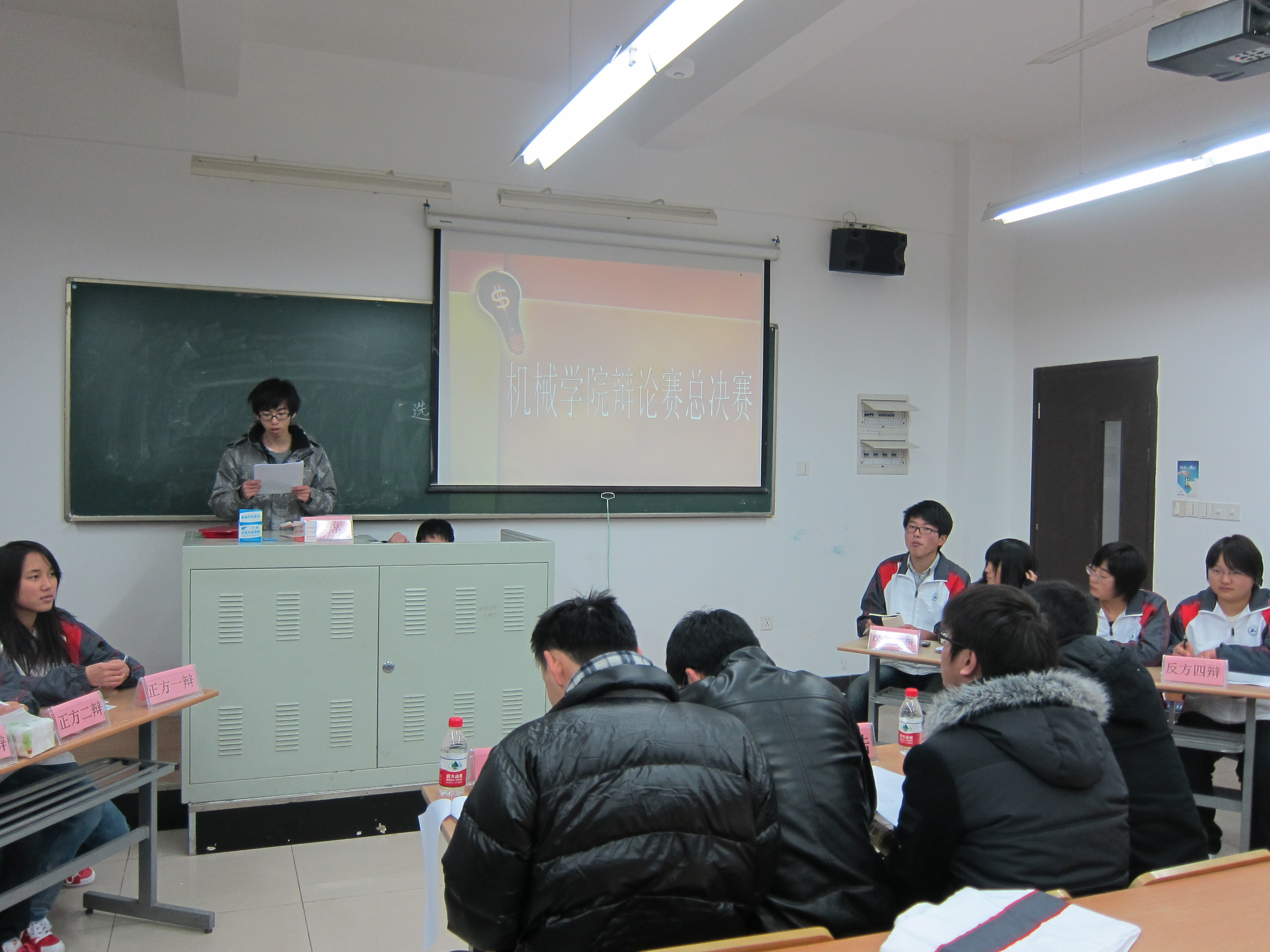12141900,由机械工程学院分团委学生会学术部策划组织的新生杯辩论赛决赛在教学楼D206隆重举行。参加本次辩论赛的评委有校辩论队领队张思哲、金山区最佳辩手黄顺、时任校实践部部长王培华、机械学院分团委副书记马宇浩,正反双方辩手,以及主持本次辩论赛的主席。现场座无虚席,同学们都拭目以待此次激烈的辩论。
