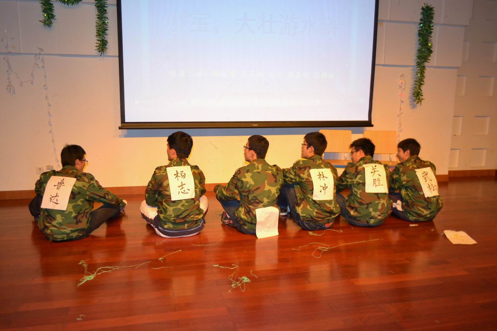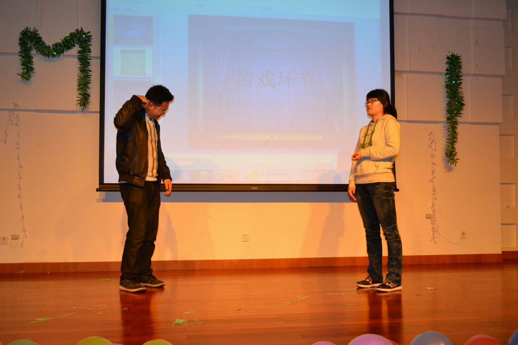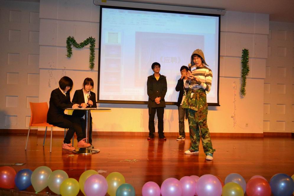 吴挺老师首先发表讲话,幽默诙谐的语言,丰富搞笑的表情,让在场的同学们笑声不断,对大家进行了学习上的敦促,对同学们的关心溢于言表。随后第一个节目——街舞《全面通缉》点爆全场。五位男同学动作潇洒帅气,舞步流畅自然,引得观众席呼声不断,掌声雷动。穿越话剧《小宝,大壮游水浒》演出阵容最为庞大。当由六位同学扮演的“梁山好汉”闪亮登场时,场内气氛瞬间点燃,观众席上的老师和同学们都笑得前仰后合。由学校魔术社社长与现场嘉宾吴挺老师带来的近景魔术表演,似真似幻,十分精彩。社长用两副纸牌变出多种花样,堪称经典。中间游戏环节——《拷贝不走样》乃的是全场亮点,学生会主席林橐与四位学长学姐最先上台。林橐学长看到“闻鸡起舞”后,将其意思以肢体动作表演给第二位学姐,每位同学依次表演给下一位同学,由第五位同学说出词语,凡参与游戏者均能得到奖品。在动作的学习与被学习中,台上的同学们绞尽脑汁,花样百出,观众席不断发出爆笑声。同学们争先恐后地举手参与游戏,本就高涨的激情被游戏瞬间引爆!接下来小品《招聘》反映了“官二代”、“农二代”和有硬文凭的年轻人对应聘的不同看法。小品《爱情疯人院》则展现了部分当代大学生对大学生恋爱的态度及做法。