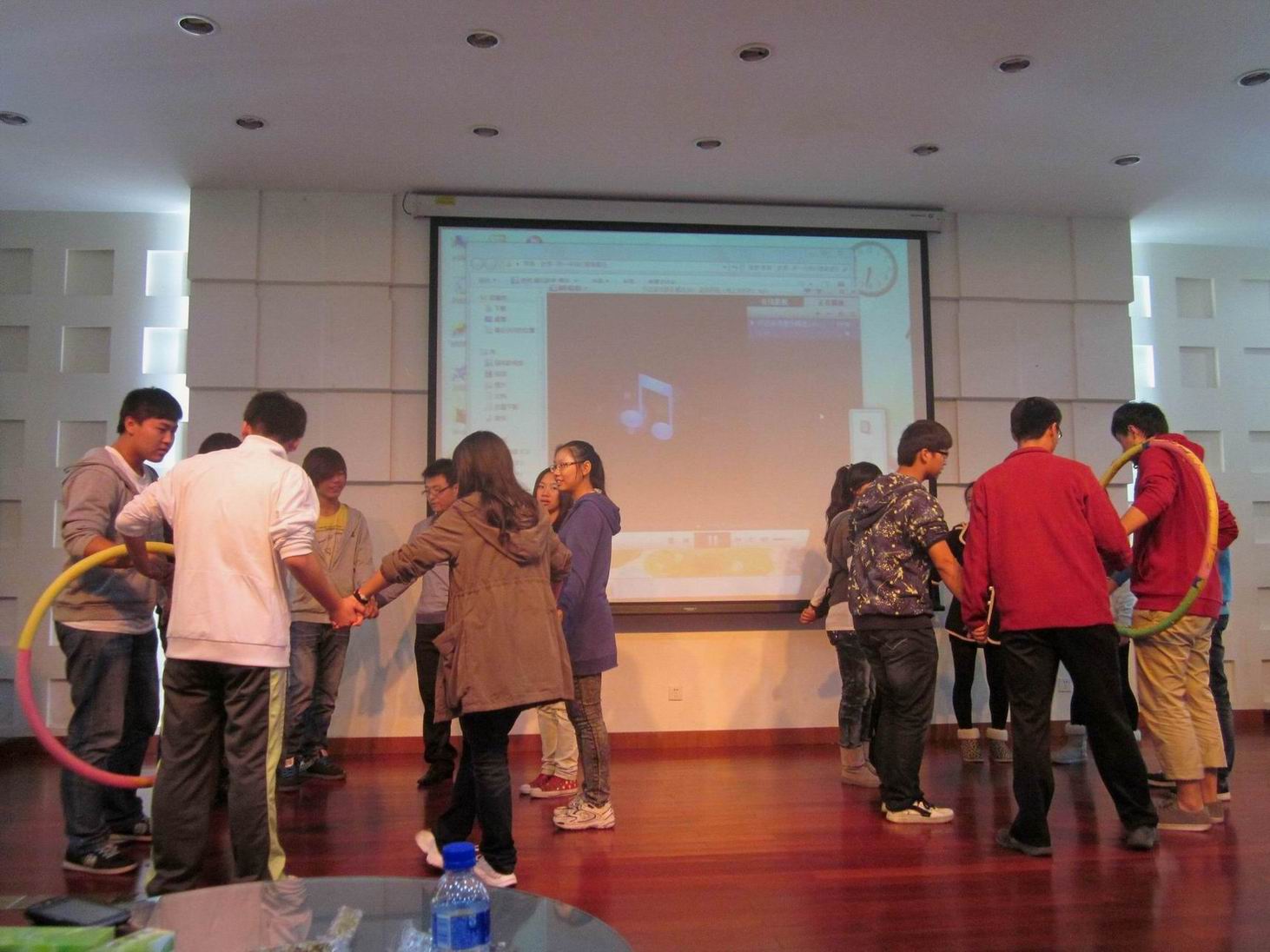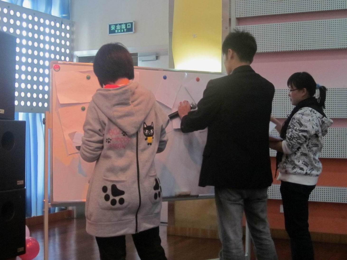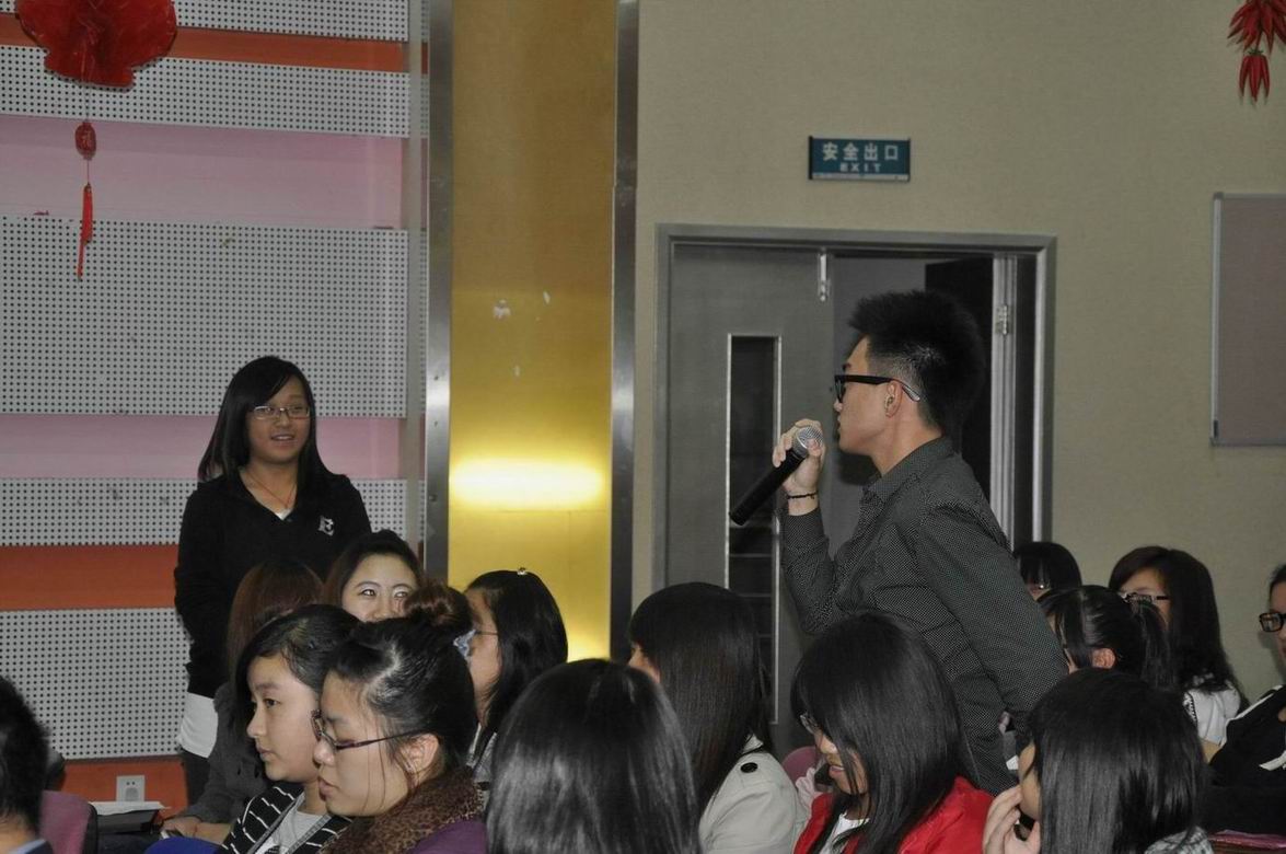 随后,闫佳明同学和钱景颖同学组织大家玩了《玩呼啦圈》《五毛一块》《蒙眼作画》等活动游戏,带动了会场的气氛,同学们积极参与,乐在其中。而陈凌同学则带领大家观看了两段关于“情”的视频,并请现场同学们交流了观后感。来自2009级运营管理专业的苏璐和孔维蓁两位同学就如何处理人际关系发表演说,两位同学根据自己的经验谈了人际交往的技巧,比如要正确认识自己、待人态度诚恳、优化个人形象、学会倾听、学会赞赏别人等,为低年级同学提供了可借鉴的经验。随后,心理剧《魔之椅》在大家的期待中登场,演员们精彩表演博得了同学们阵阵掌声。由2011级运营管理专业同学合唱的《相亲相爱一家人》将活动的气氛推向最高潮。
