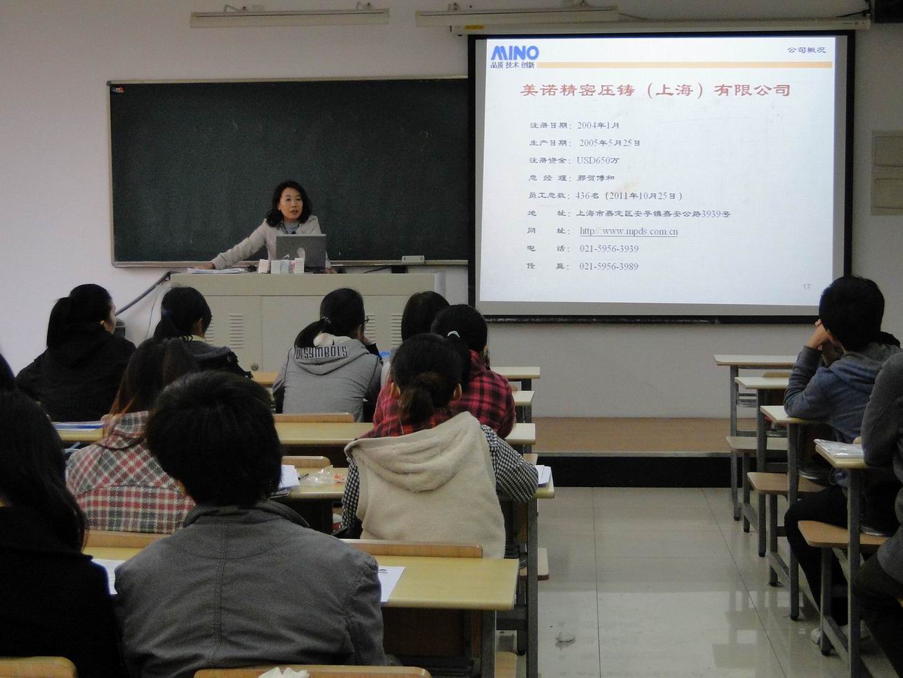1123下午15:00 ,由材料工程学院承办的美诺精密压铸(上海)有限公司招聘会于教学楼A211举行。美浓工业集团的总务部次长邵海霞主持此次招聘会,材料工程学院辅导员吴挺,美诺精密压铸(上海)有限公司生活技术部、铸造技术课系长沈丽娜,以及材料工程学院、机械学院两院的大四学生代表参加了此次招聘会。