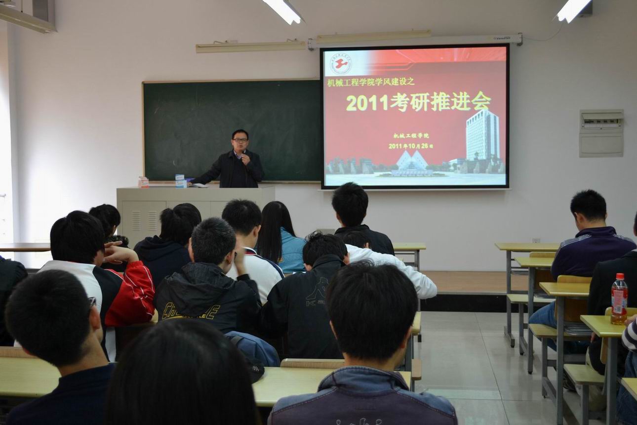1026中午,机械工程学院在教学楼C303召开 2011年学院考研推进会。此次考研推进会是机械工程学院2011学风建设年系列活动之一。机械工程学院党总支副书记朱蓓老师,院长助理茅健老师以及全体辅导员参加了推进会。近90名正在考研或者准备考研的三、四年级学生参加了推进会。推进会由学院党总支副书记朱蓓老师主持。