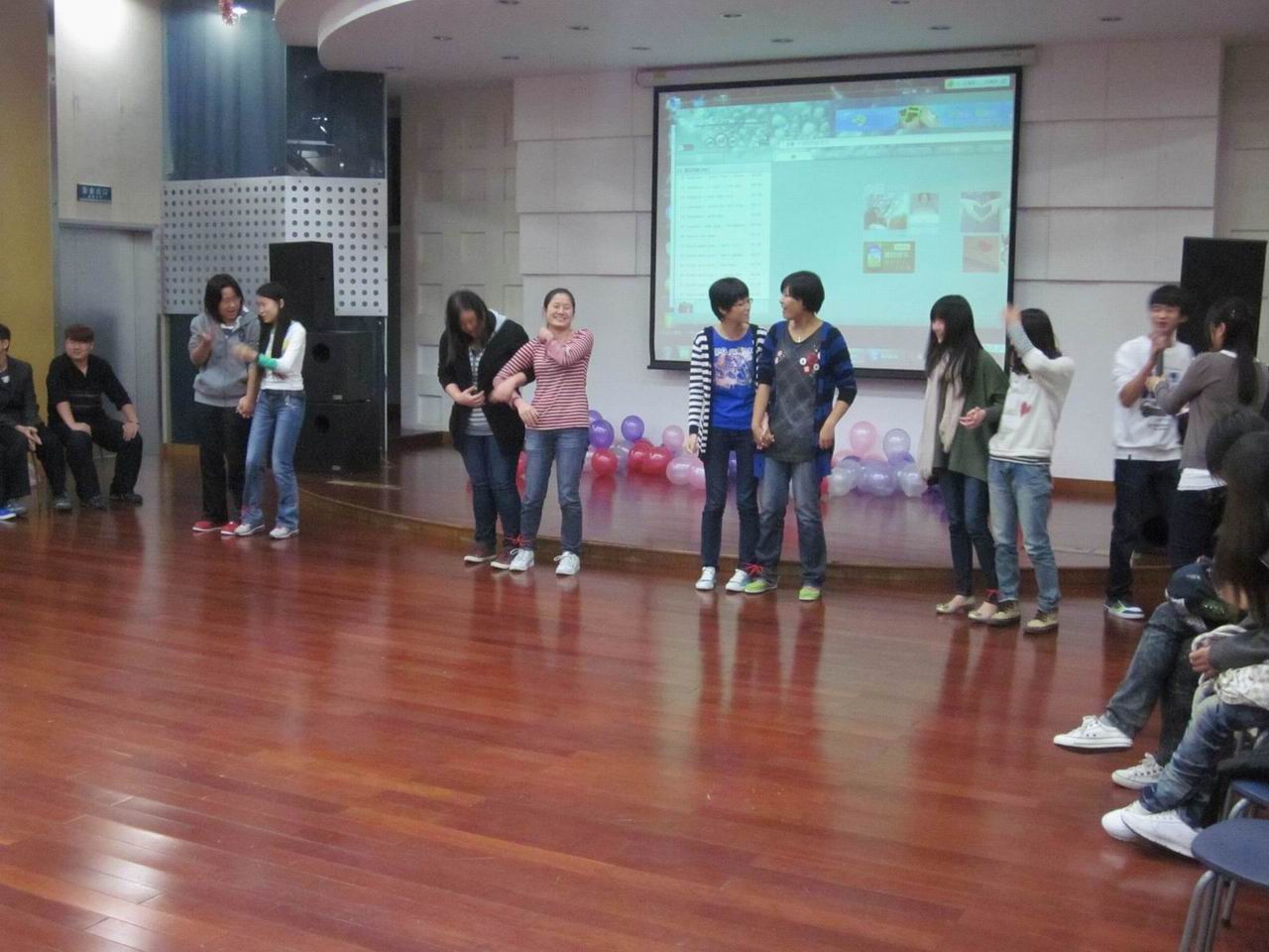 由金佳雯老师致辞宣布本次比赛正式开始后,参赛八组寝室——上场进行自我展示和才艺表演。八个寝室都制作了一部短片,向大家展示了本寝室四位室友间生活的点滴、愉快的瞬间,更有大家一起布置的温馨寝室的照片。在几组寝室表演中还加入了一些体现寝室配合与默契的小游戏,例如:两人三足、你来比划我来猜拳等,为本次大赛增添更多趣味的同时,也能让评委们从更多的角度对八组寝室进行评比。接着,还有与现场观众互动的“蔬菜蹲”游戏,大家玩得好不欢乐!