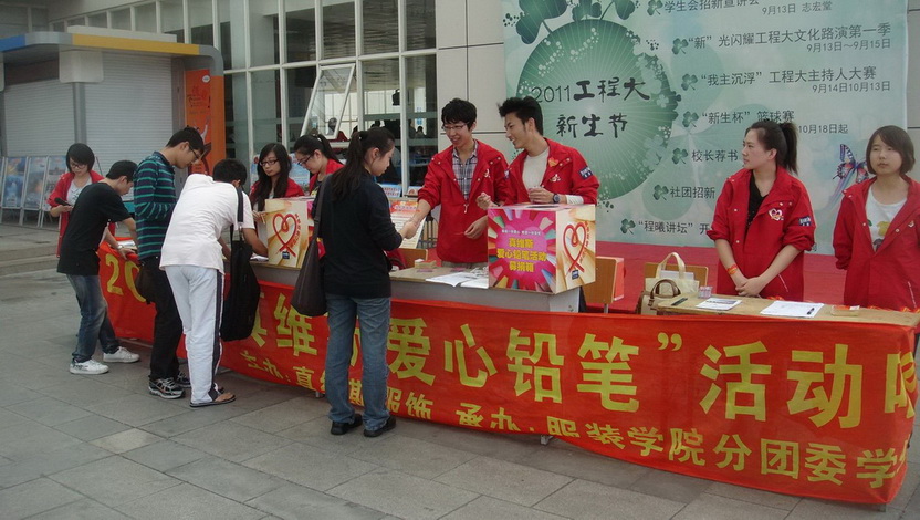 10月12日、13日,由服装学院分团委学生会主办的“真维斯爱心铅笔捐赠”活动在上海工程技术大学的大小食堂如期举办。服装学院党总支书记袁蓉、党总支副书记李扬和分团委书记沈智莉书记也莅临现场献上爱心。捐赠活动在大食堂前掀起了一股爱心热潮,本次活动吸引到了很多学生志愿者参与其中。