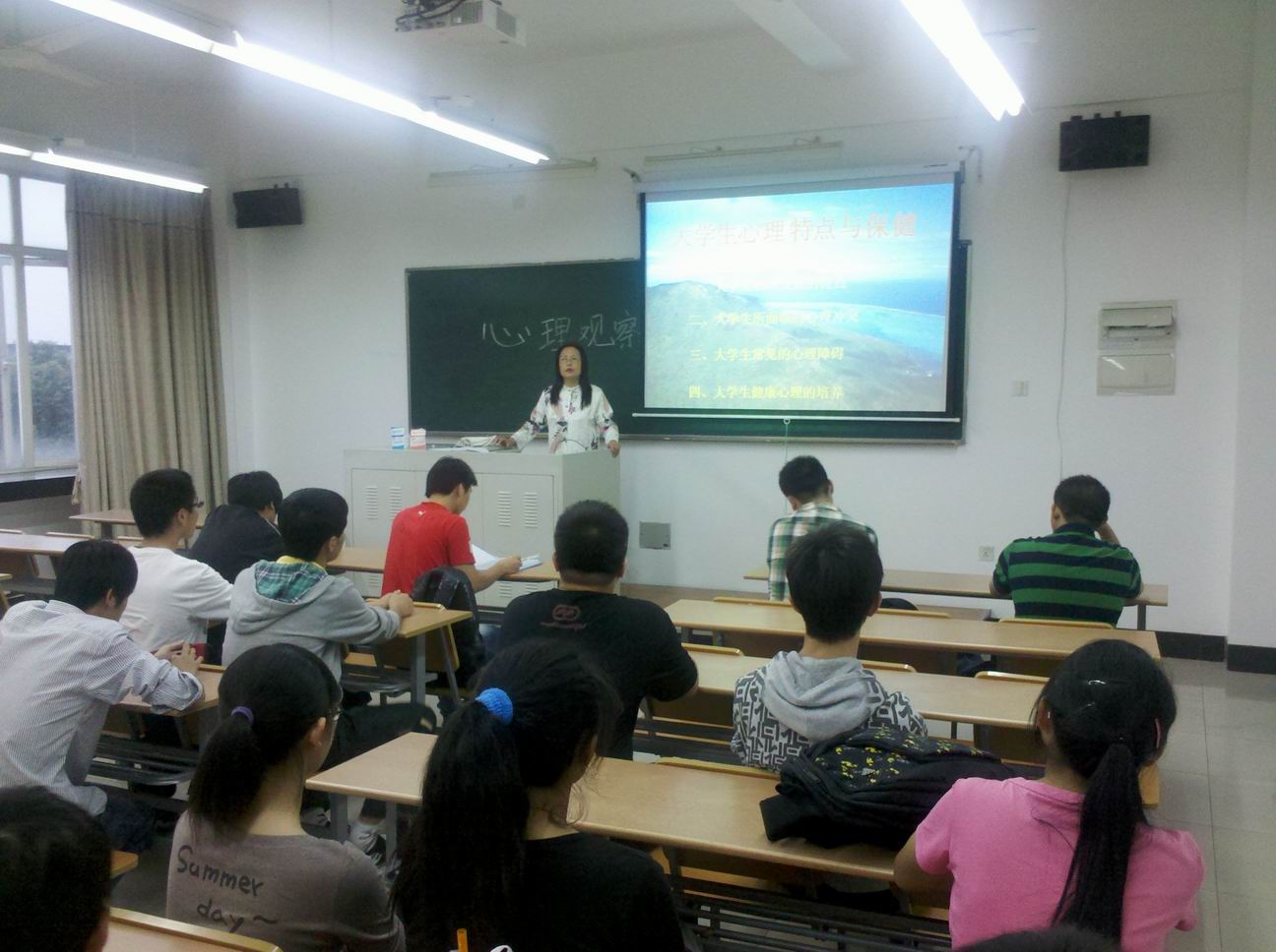 汽车工程学院大学生心理健康朋辈互助站,1012下午500,在教学楼D310室开展了大型培训讲座。讲座以“大学生心理特点与保健”为主题,由院心理健康辅导教师沈丽老师主讲,连同新生年级在内的三个年级的心理观察员和朋辈互助站成员,共计32名同学参加了此次培训。