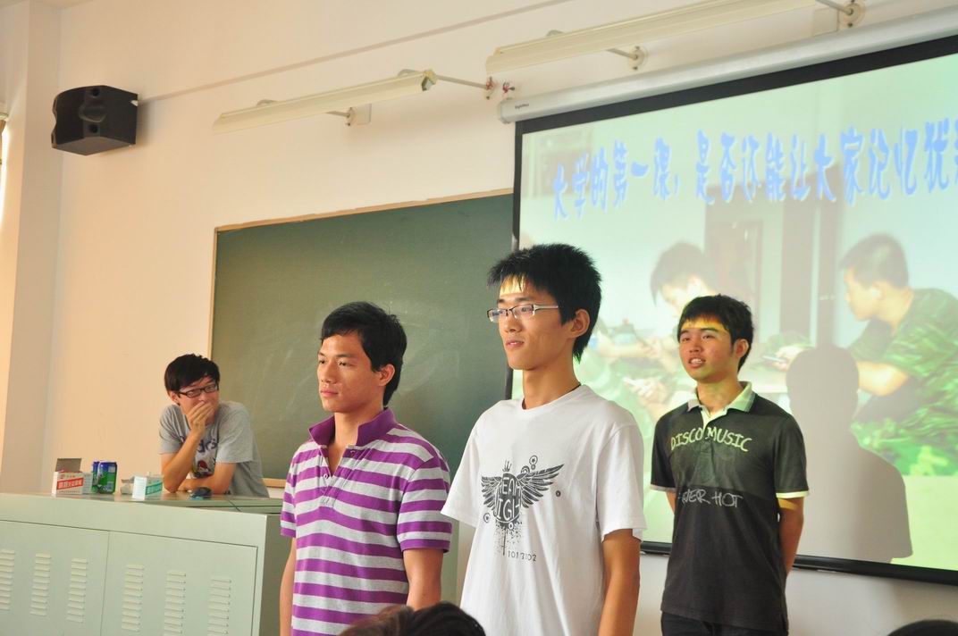 班会第一环节以大家共同的回忆为重点,大屏幕上打出的第一张照片,是全班同学开学第一次相聚在教室的场景,这唤起了同学们最初的回忆。接着陈彬、苏东胜、林志伟等同学为大家带来了原创的小品,带同学们回到了难忘的军训时期,引得同学笑声阵阵。然后,高军和孙桢炎同学表演的小品在班级活动照与抒情音乐的映衬下显得格外生动,小品中再现了我们大学生活的真实场景,说出了许多同学的心声,把会议的气氛推向高潮。班会的第二个环节以展望未来为主题,本学期新组成的班委成员们依次上台向同学们讲述了新学期的计划,并希望通过大家的共同努力,争取在12月的四级考试中取得优异的成绩。最后,同学们集体拍照留念,班主任胡华老师总结这次班会并发言,期望大家新学期能有新的面貌、新的收获。