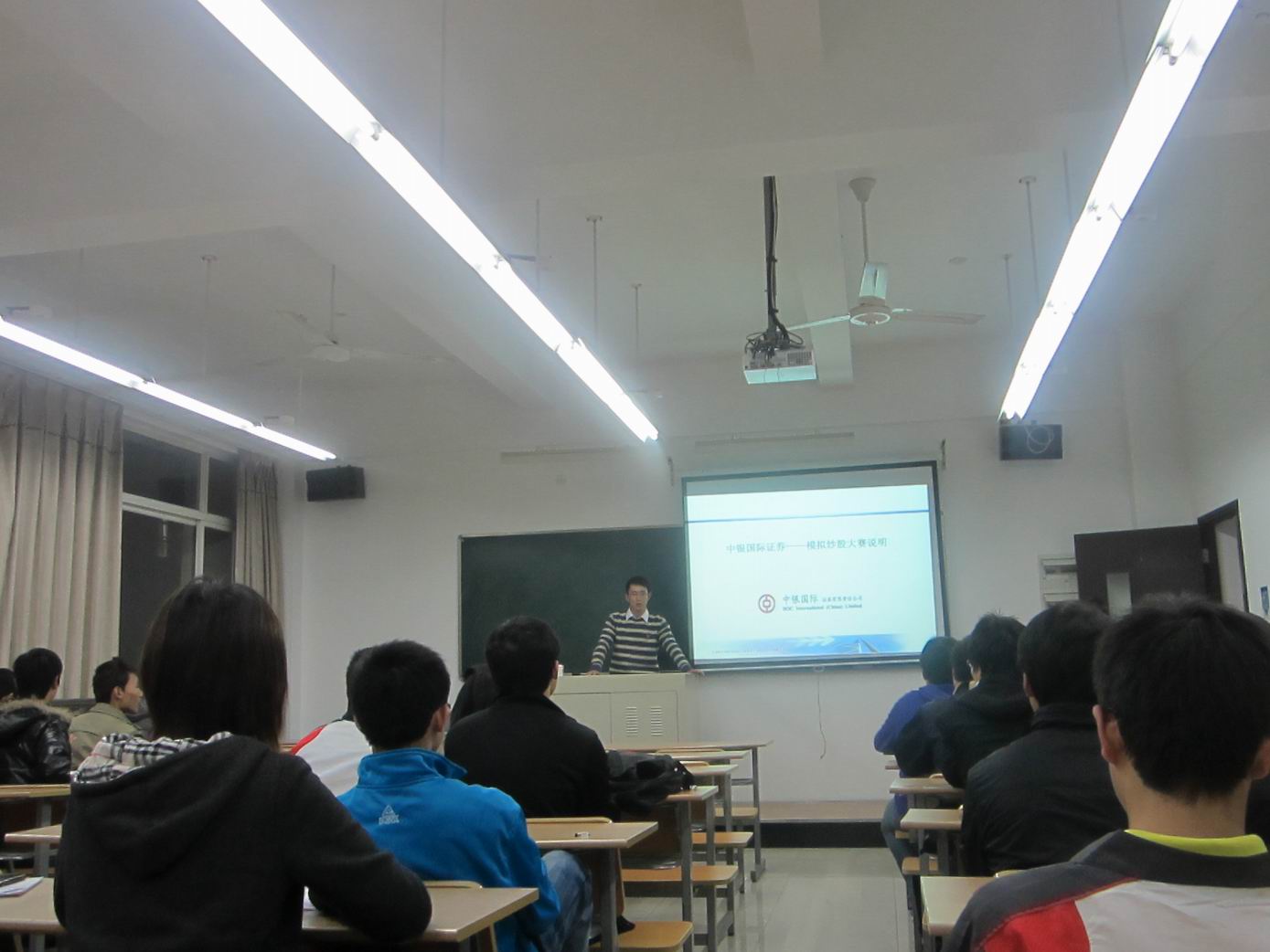老师向大家简单介绍了一些关于炒股的相关知识,涉及金融股票的基本概念,什么是股票以及如何炒股。同时,老师也鼓励大家平时多了解一些关于金融方面的知识,在实践中掌握炒股的基本技能,最后,老师向同学们介绍了中银国际证券模拟炒股的相关情况并希望大家积极参与。