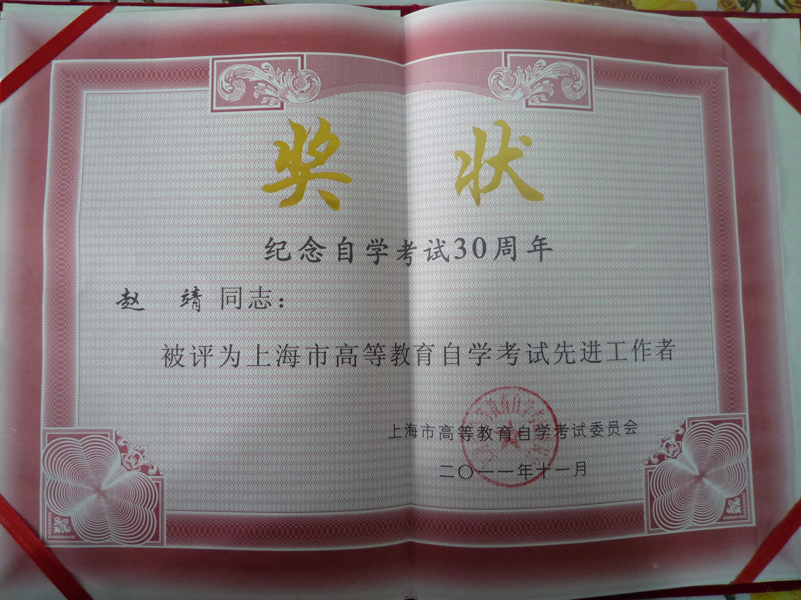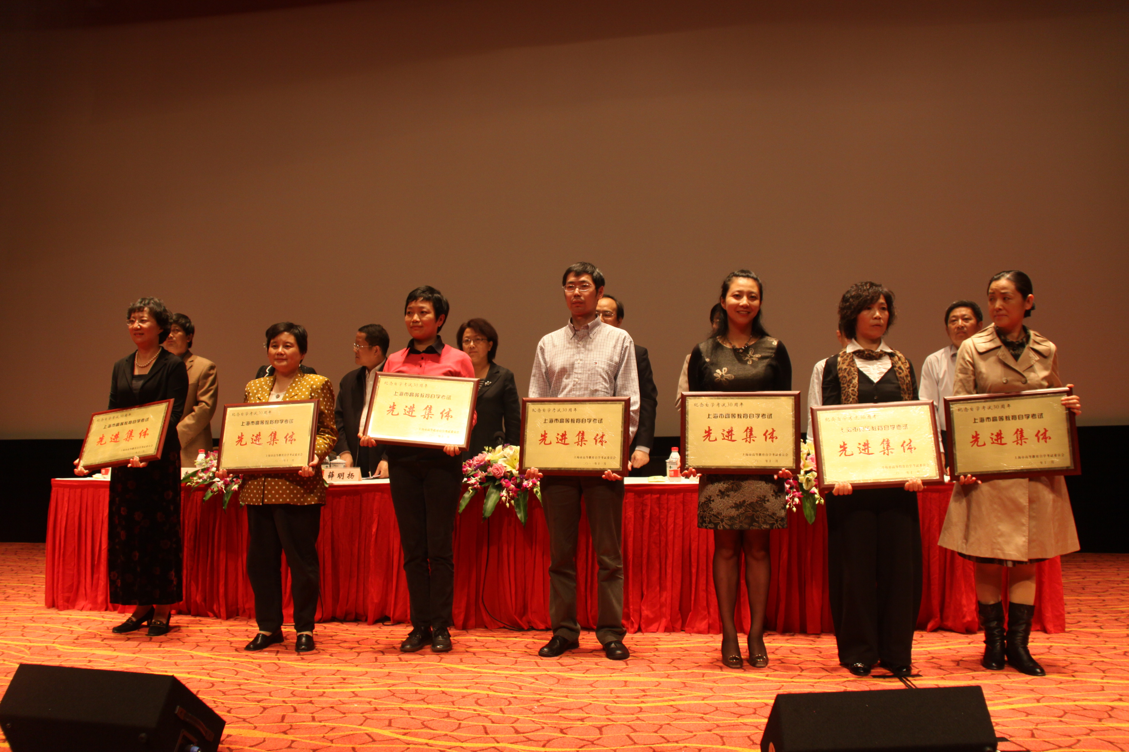 1118在上海影城隆重举行的纪念高等教育自学考试制度实行30周年暨表彰大会上,我校自考办获取先进集体荣誉称号,我校自考办赵靖老师获先进工作者称号,袁海燕同学获优秀学员称号。教育部考试中心党委书记、副主任刘军谊,市政府副秘书长、市高教自考委第一副主任委员翁铁慧,市教委主任、市高教自考委常务副主任委员薛明扬,市教委副主任李瑞阳、袁雯等领导出席了本次会议并颁奖。会议由市教委副主任李瑞阳主持。