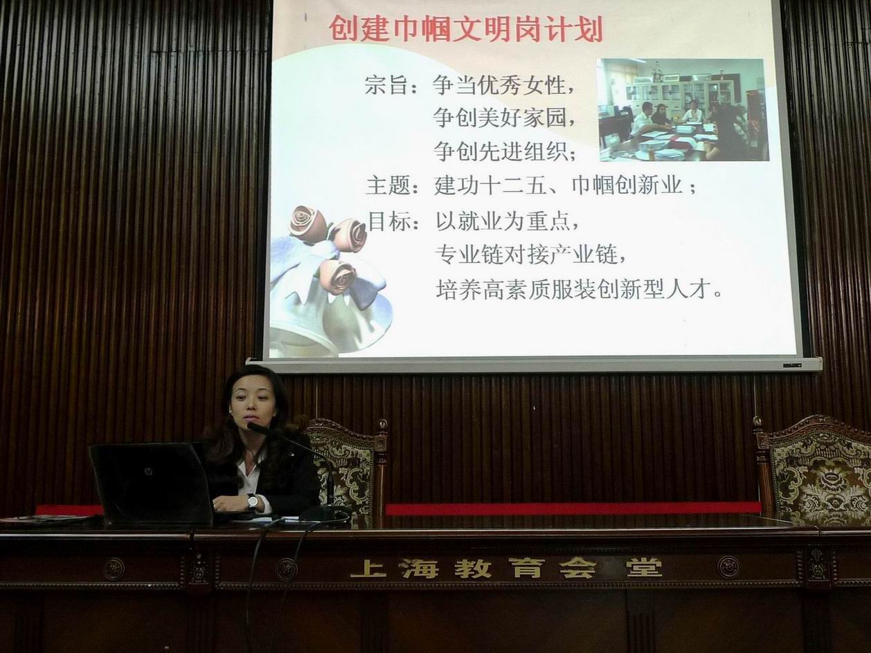 为贯彻落实《关于创先争优在教育系统开展巾帼文明岗创建活动的通知》(沪教妇(2011)第4号文件)精神,进一步推进上海市和上海市教育系统巾帼文明岗创建工作的顺利有序开展,1123日下午13:30在上海教育会堂四楼讲演厅举行了巾帼文明岗创建集体PPT交流会。校女工委副主任朱翔、服装学院党总支书记袁蓉、服装学院就业辅导员郑艳、基础教学部工会主席张蓓、高职学院基础教学部主任陈丹晔参加了此次交流会。