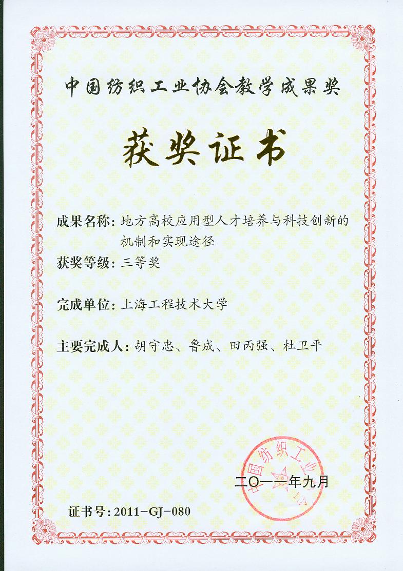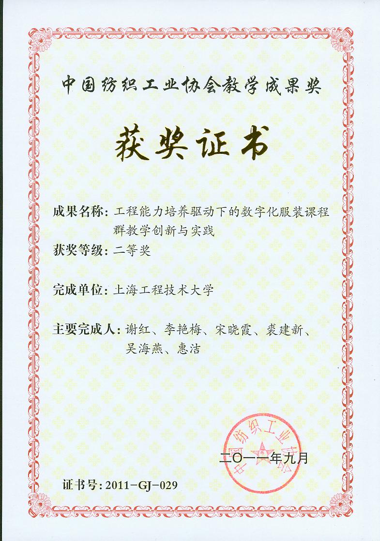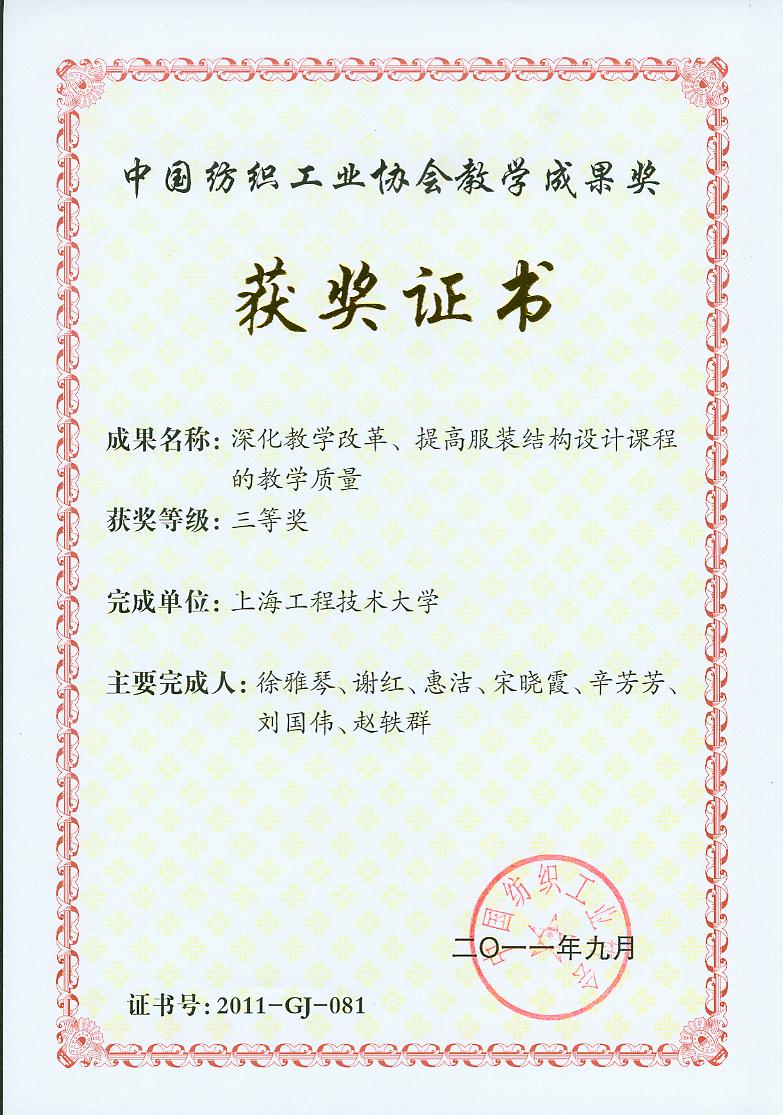 本次大会共颁发纺织高等教育教学成果一、二、三等奖125项,我校服装学院4项成果喜获“纺织之光”2011年度中国纺织工业协会纺织高等教育教学成果奖,其中由谢红教授等完成的“工程能力培养驱动下的数字化服装课程群教学创新与实践”荣获二等奖,由胡守忠教授等完成的“地方高校服装应用型人才培养与科技创新的机制和实现途径”、陈莹教授等完成的“对服装设计创新人才培养体系的国际化研究”以及徐雅琴老师等完成的“深化教学改革、提高服装结构设计课程的教学质量”三个项目荣获三等奖。