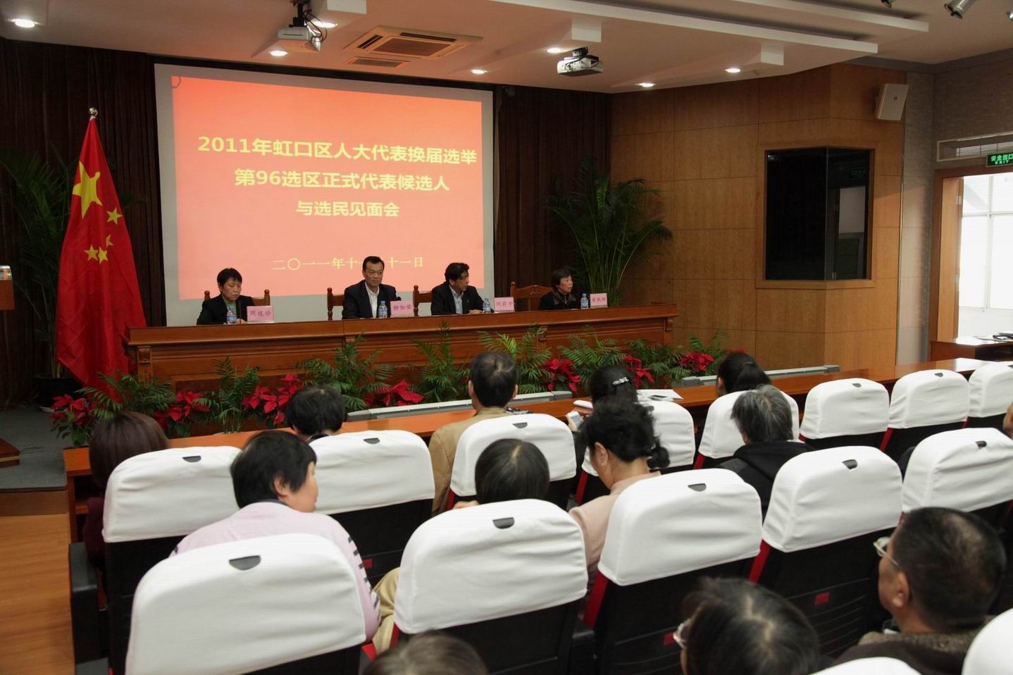 根据虹口区人大换届的总体安排,为切实落实第96选区的选举工作,2011年11月11日下午,虹口区人大代表换届选举第96选区正式代表候选人与选民代表见面会在高职学院举行。江湾镇街道党工委书记耿��、高职学院党委书记柳如荣、虹口区人民政府江湾镇街道办事处副主任濮正虎等选举工作组领导出席了见面会。会上,第96选区的3位代表正式候选人,高职学院院长刘启中、纪念居委会推荐代表周连珍、柴姚妹与本选区选民代表们近距离接触,进行了一次面对面的交流。会议由高职学院党委书记柳如荣主持。