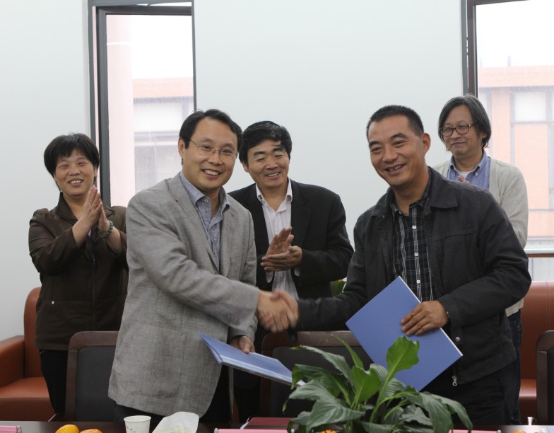 在双方愉快的交流后,张杰院长与阡陌创意文化发展有限公司金春云总经理正式在合约上签字。双方手执合约,热情的互相握手,现场响起了热烈的掌声。